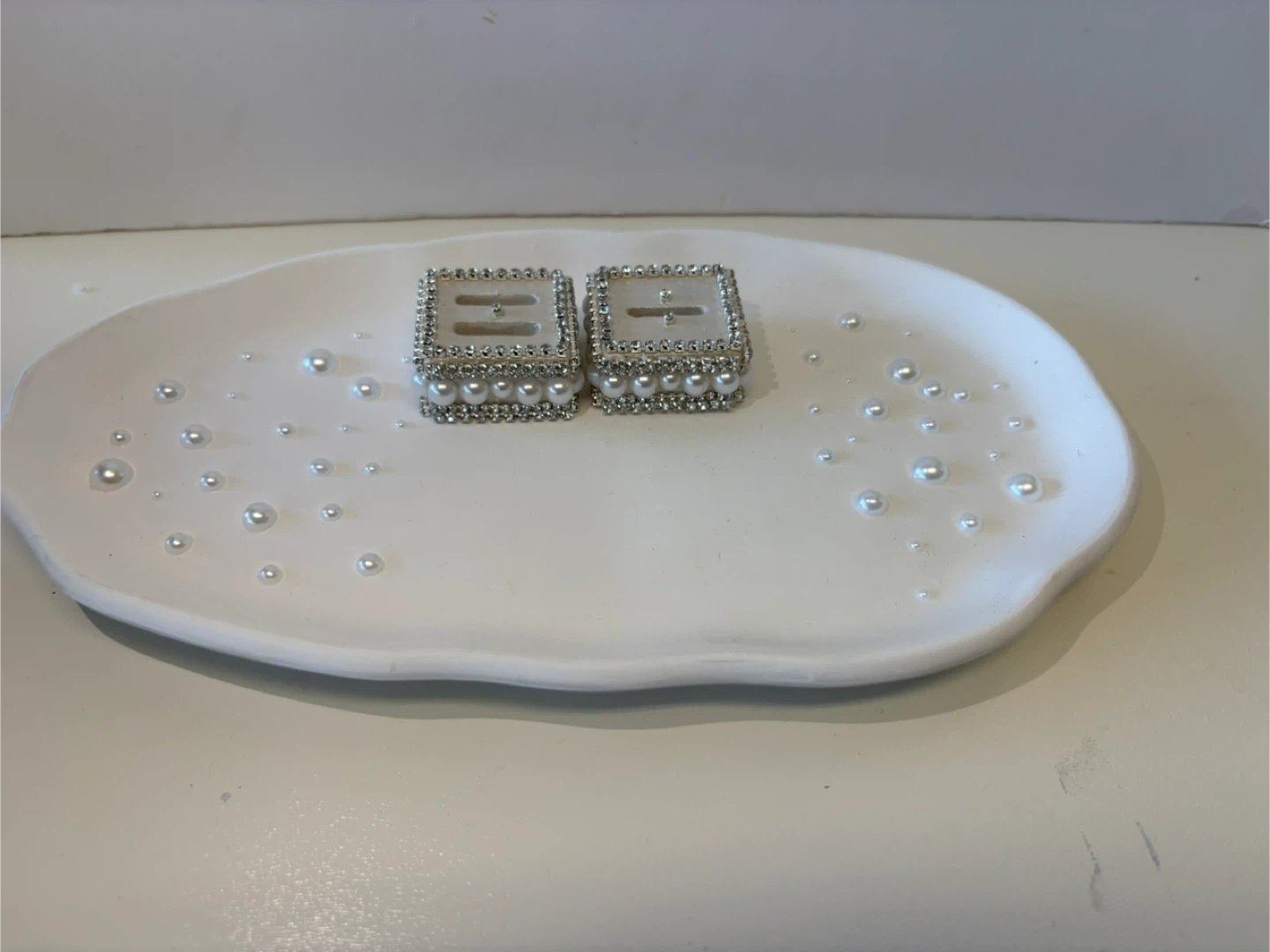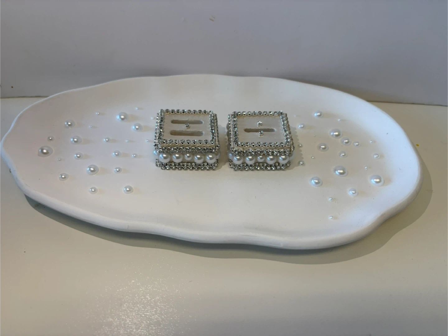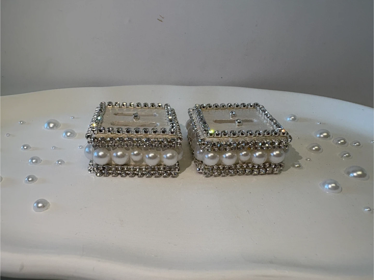 • The Ring Holders: Two matching square pedestals heavily embellished with high-shine crystals and luster pearls. Each holder features a secure slot to display your most precious rings upright.