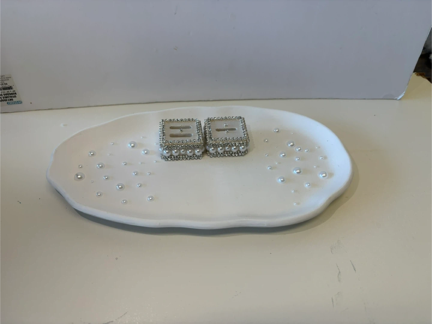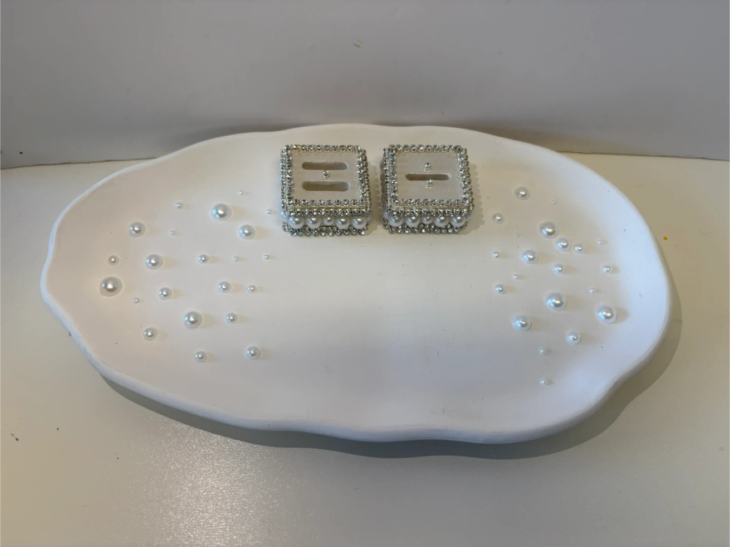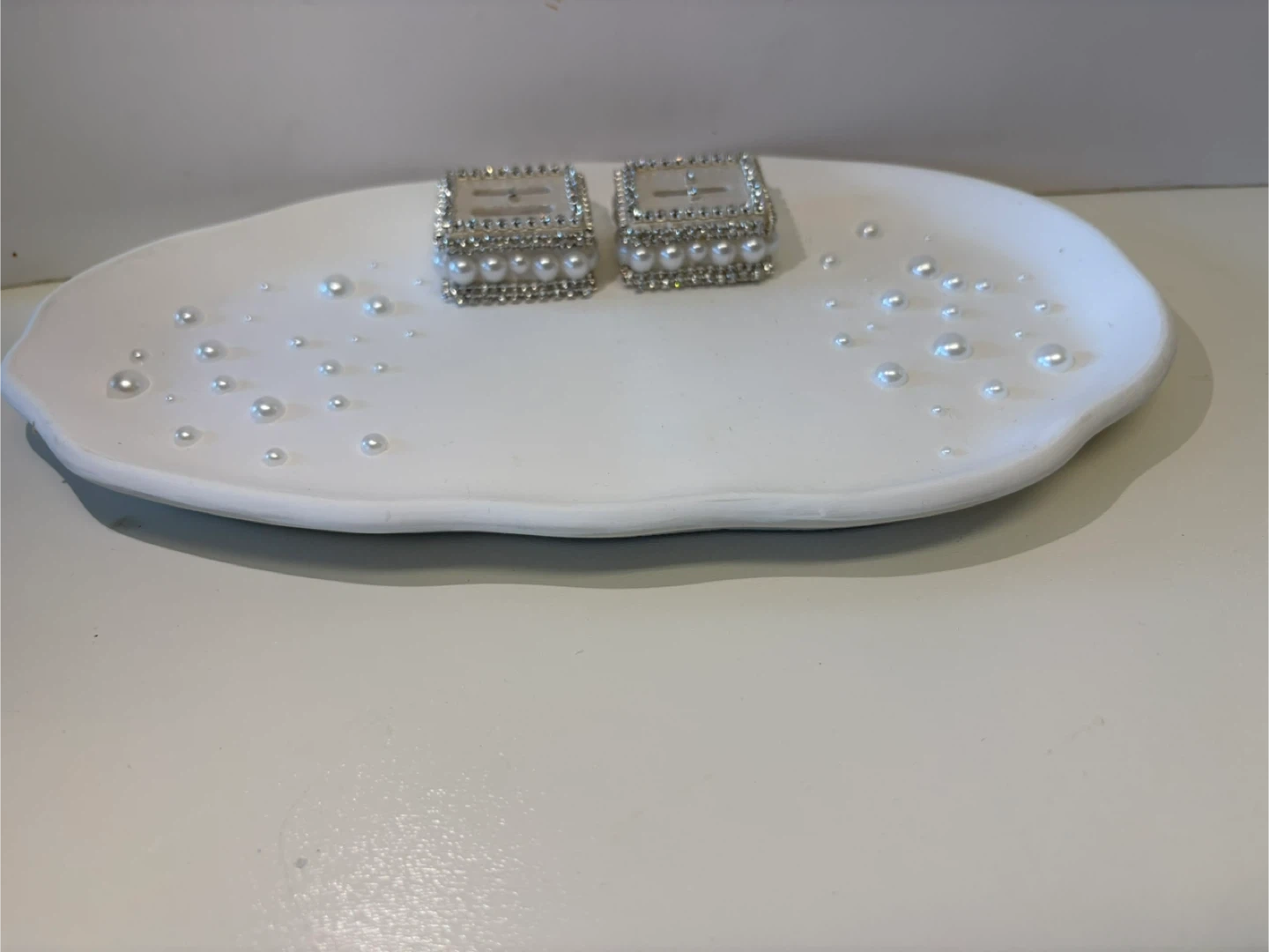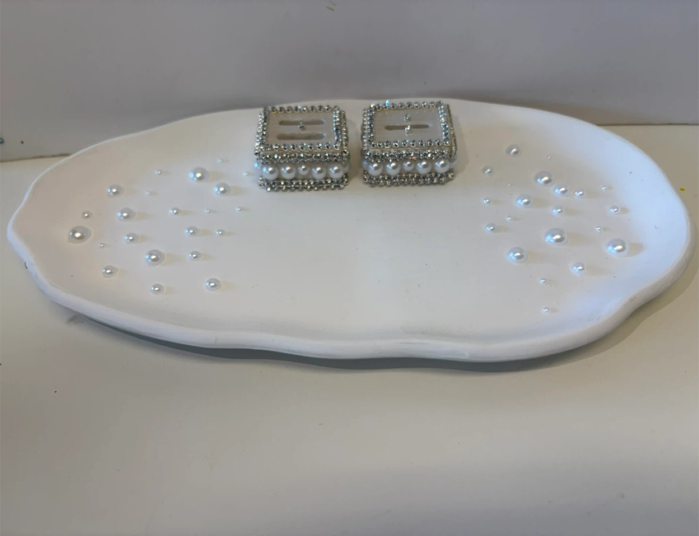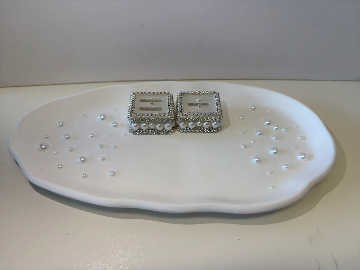 • The Ring Holders: Two matching square pedestals heavily embellished with high-shine crystals and luster pearls. Each holder features a secure slot to display your most precious rings upright.