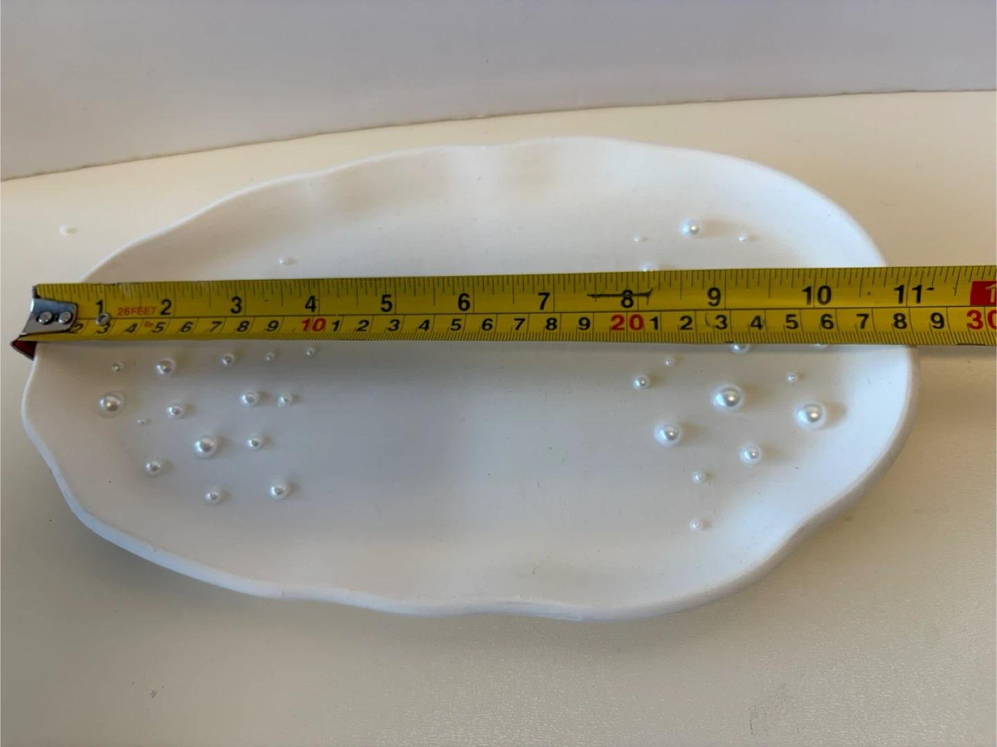 • The Tray: A hand-sculpted, oval-edge tray in a crisp matte white, delicately accented with scattered pearls for a "floating" effect.