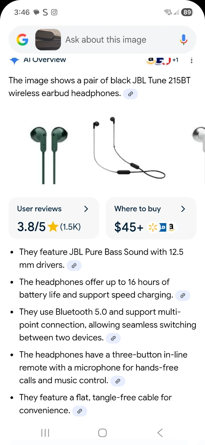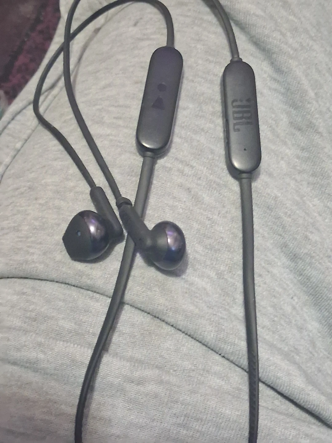 Black JBL Tune 215BT wireless earbuds with 12.5 mm drivers. They feature Bluetooth 5.0 and a flat, tangle-free cable. The headphones offer up to 16 hours of battery life. Includes a three-button in-line remote with a microphone.