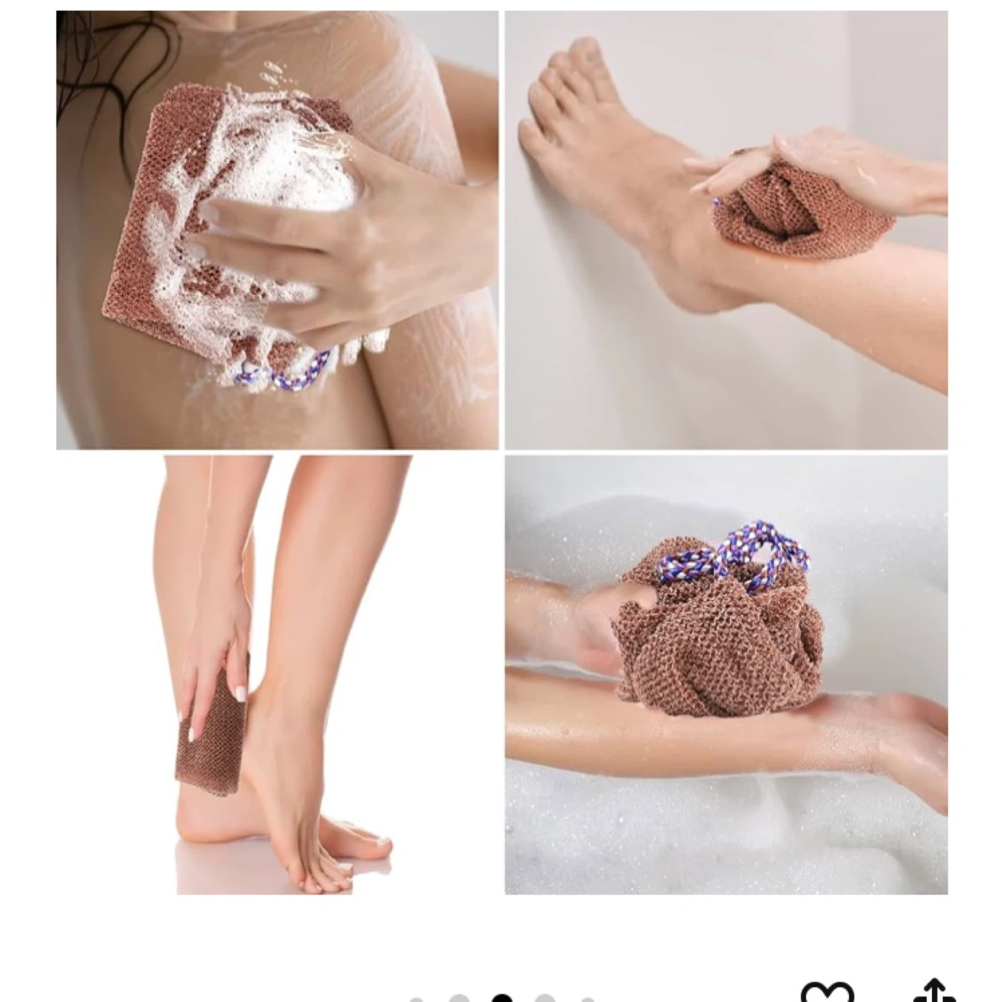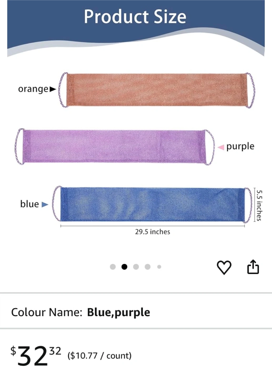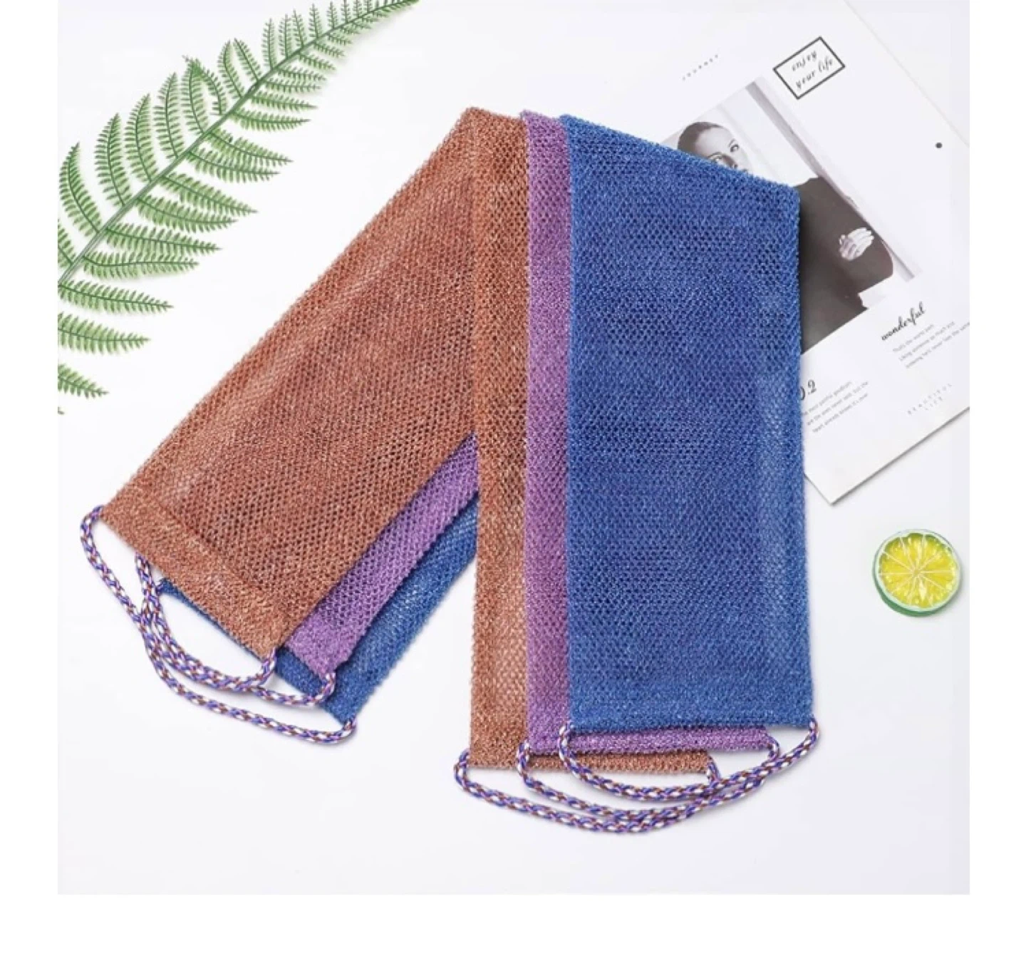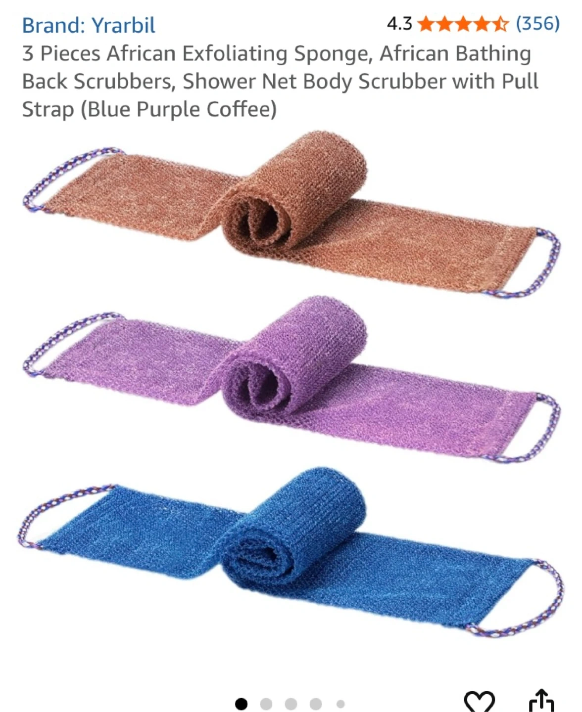 This set includes three African net sponges designed for daily body cleansing. They are rougher than a standard bathing cloth but soft enough for everyday use. The sponges feature cords for hanging on the wall after bath time, saving space. They are approximately 29.5 inches long and 5.5 inches wide.