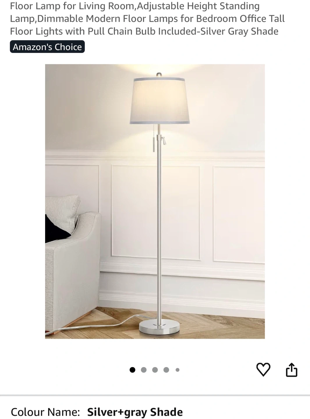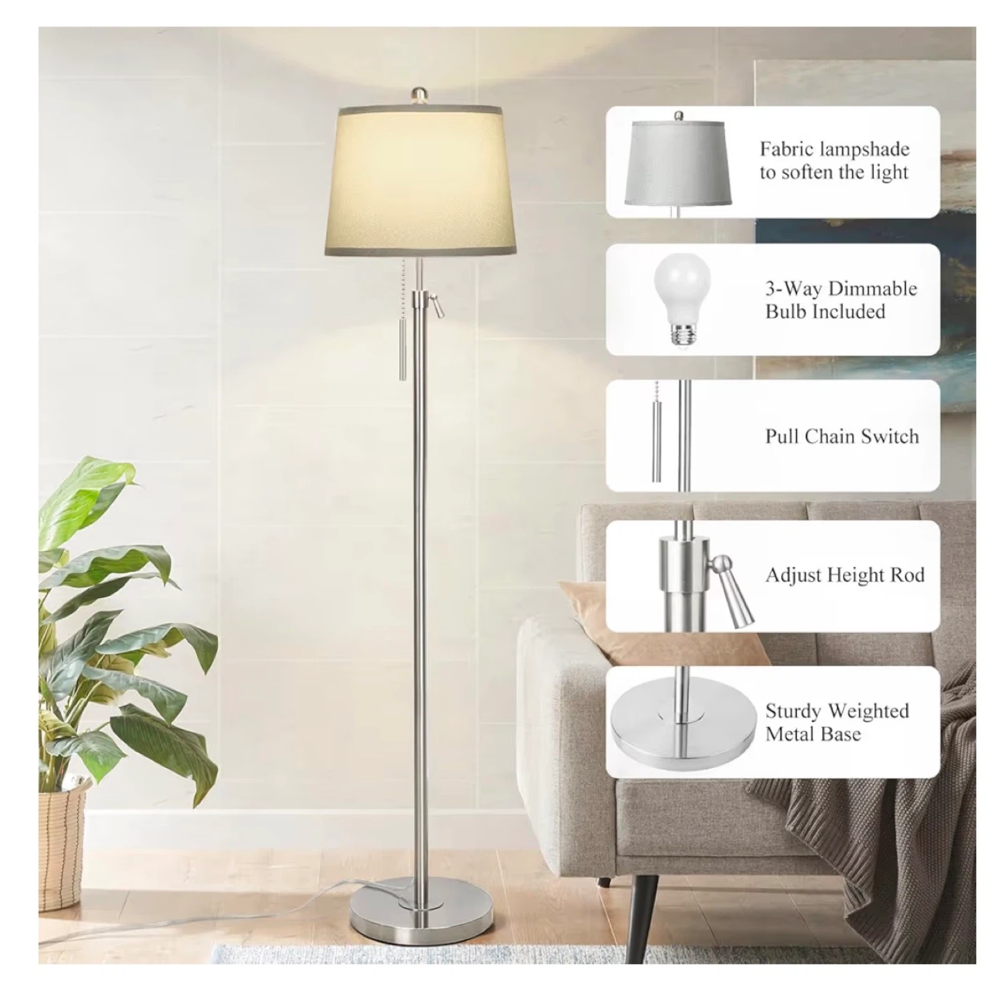 This floor lamp features a silver and gray shade with a pull chain switch and an adjustable height rod. It includes a 3-way dimmable LED bulb and a sturdy weighted metal base. Perfect for living rooms or bedrooms!