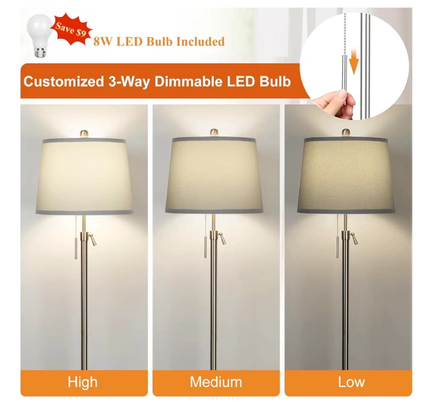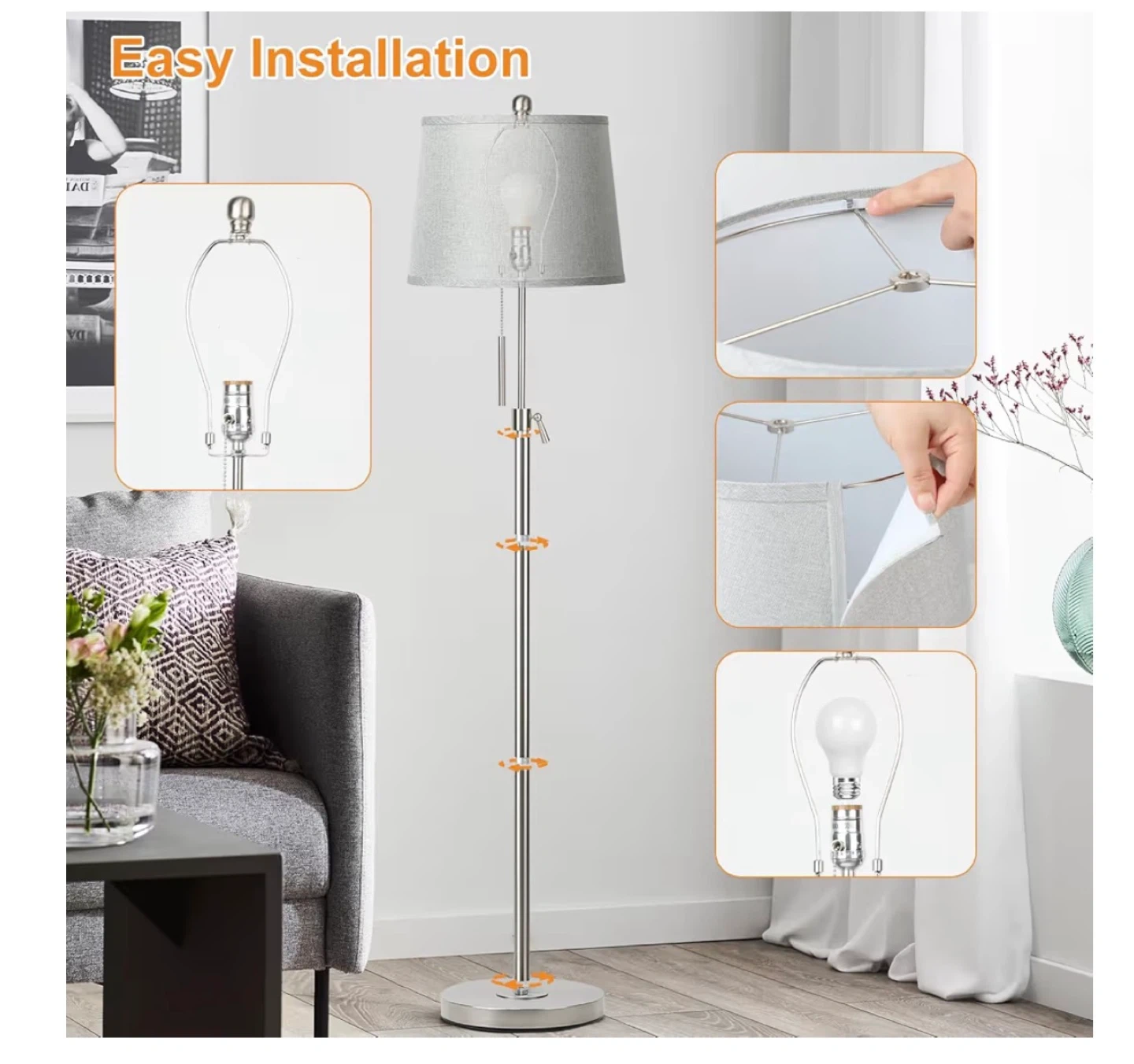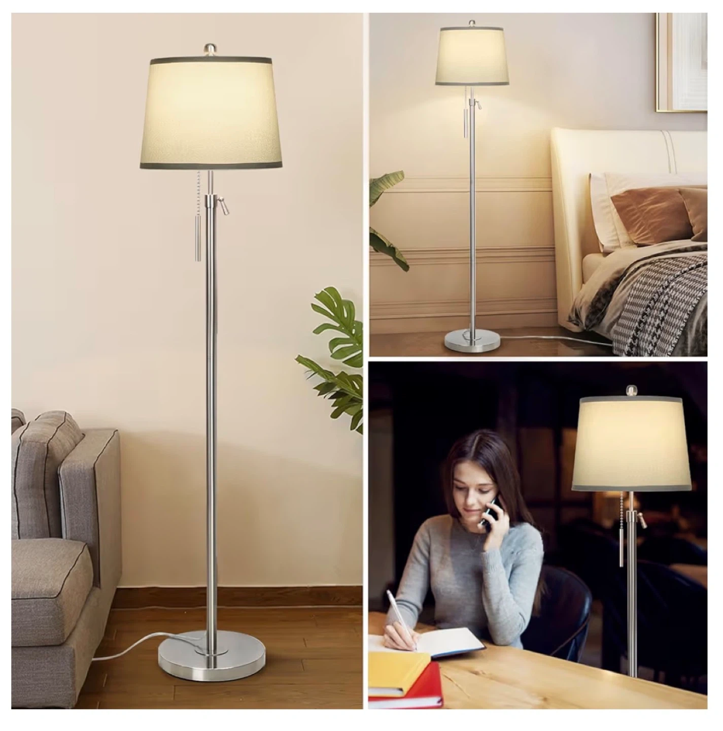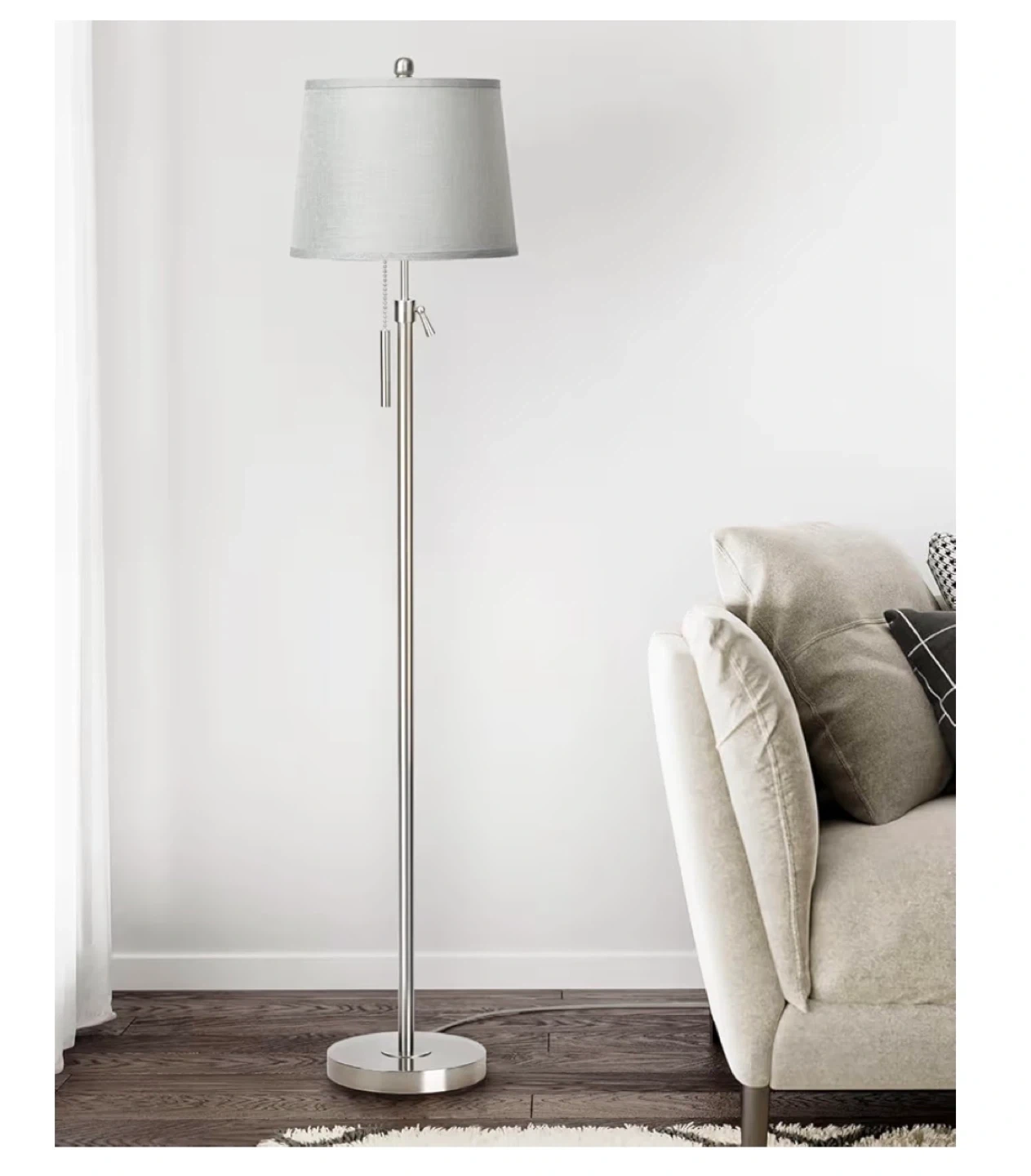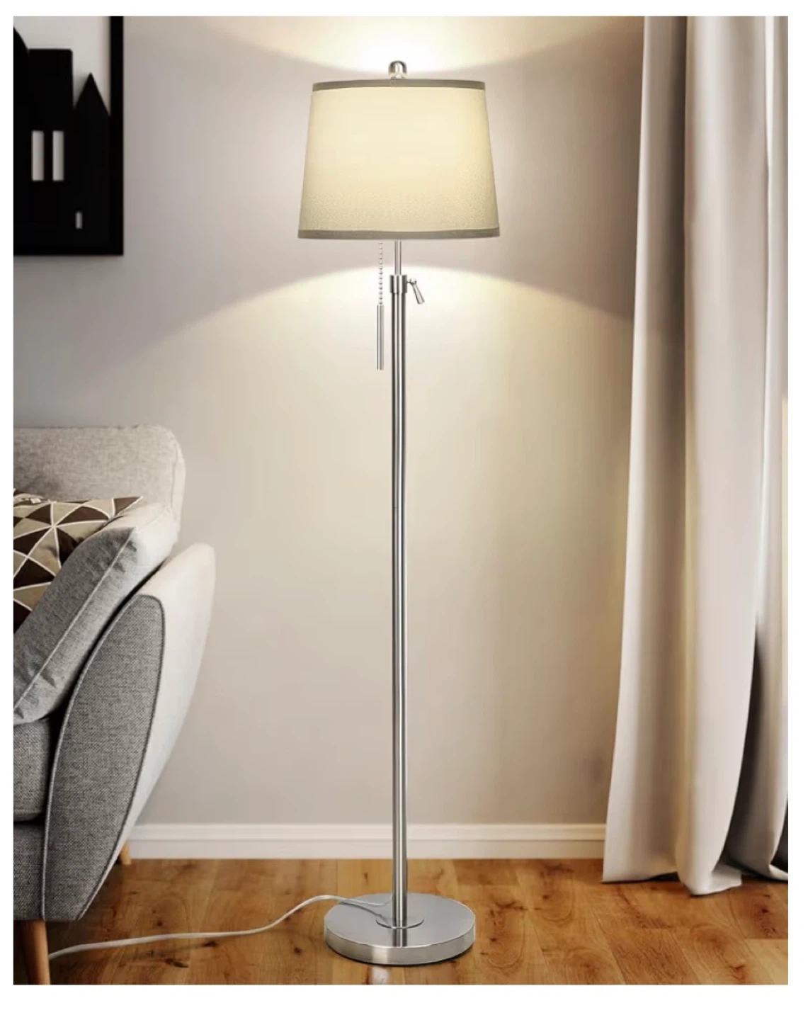 This floor lamp features a silver and gray shade with a pull chain switch and an adjustable height rod. It includes a 3-way dimmable LED bulb and a sturdy weighted metal base. Perfect for living rooms or bedrooms!