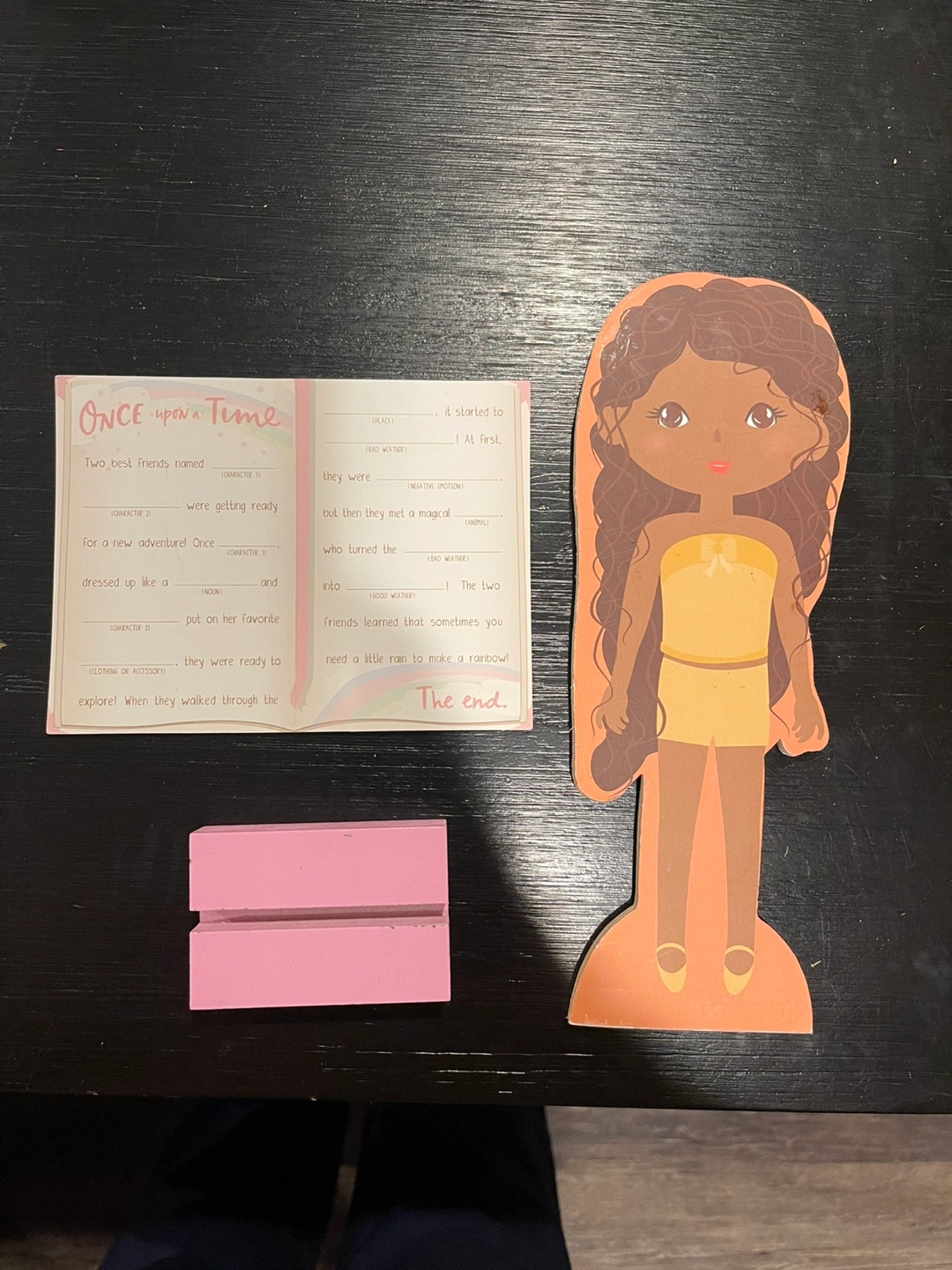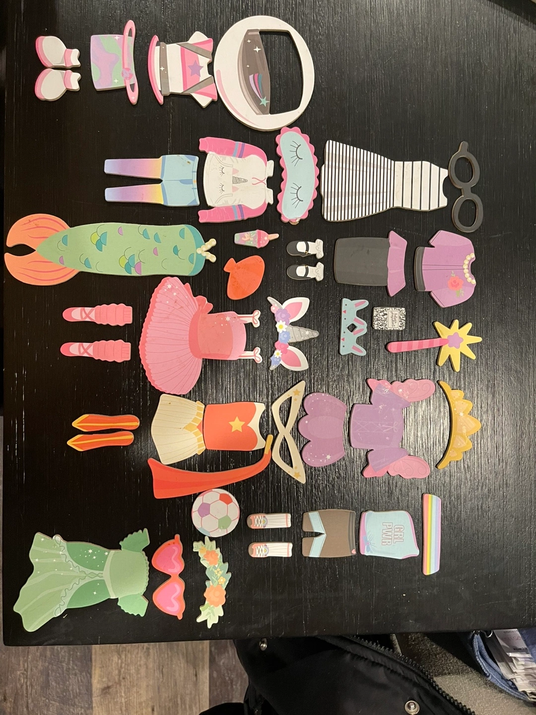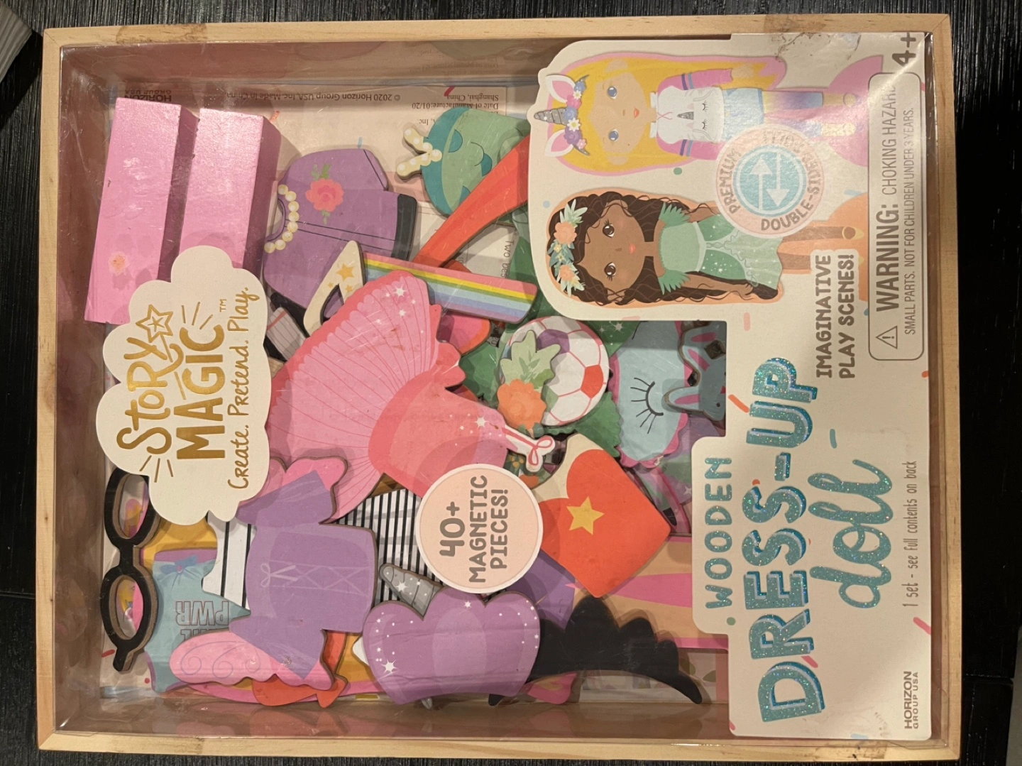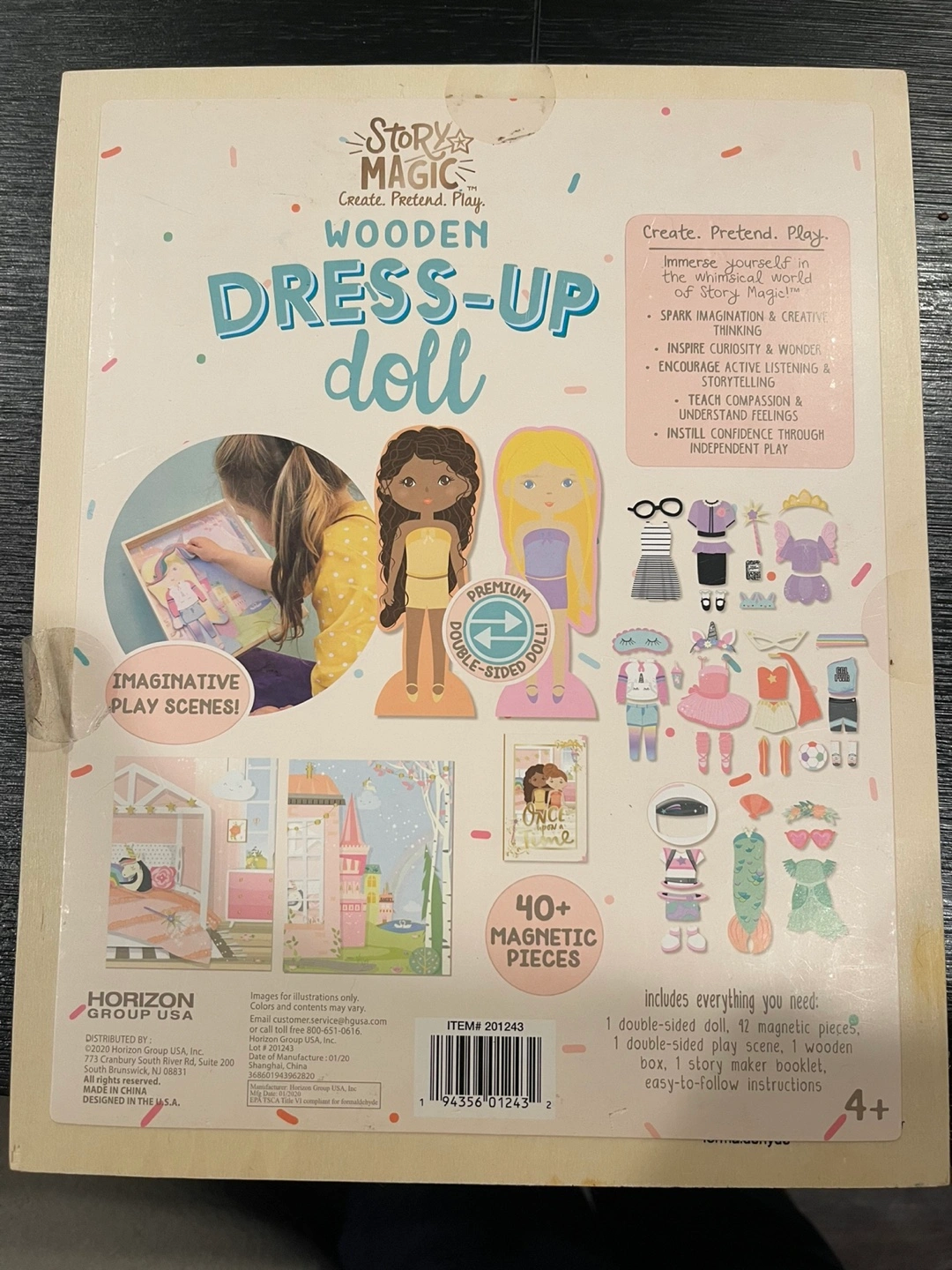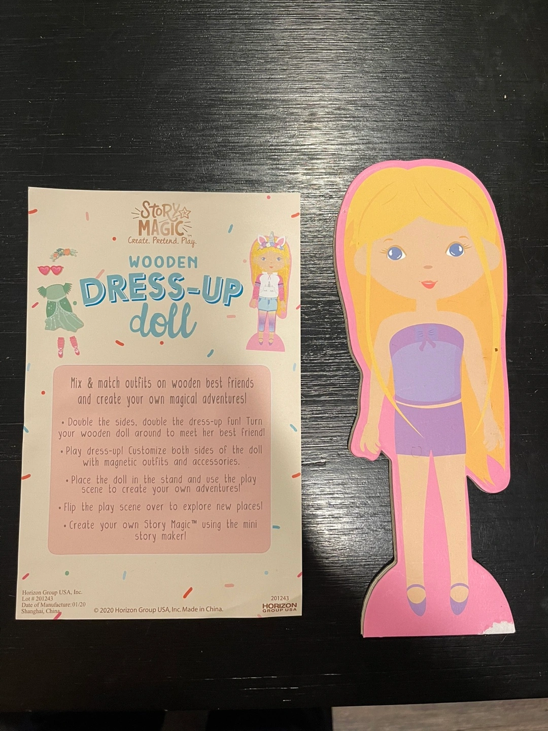 Magnetic wooden dress-up doll. Includes multiple outfits and accessories. Double-sided doll. Create imaginative play scenes. Great for imaginative play.