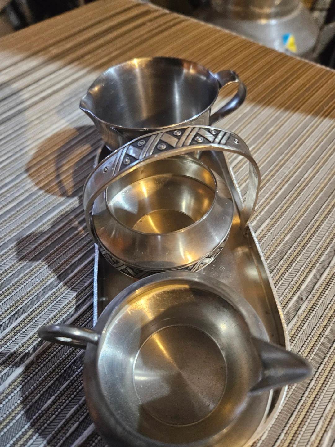 This is a silver-plated serving set featuring a tray with three small cups and a pair of tongs. It also includes a creamer and sugar bowl with a handle. Great for serving condiments or small appetizers!