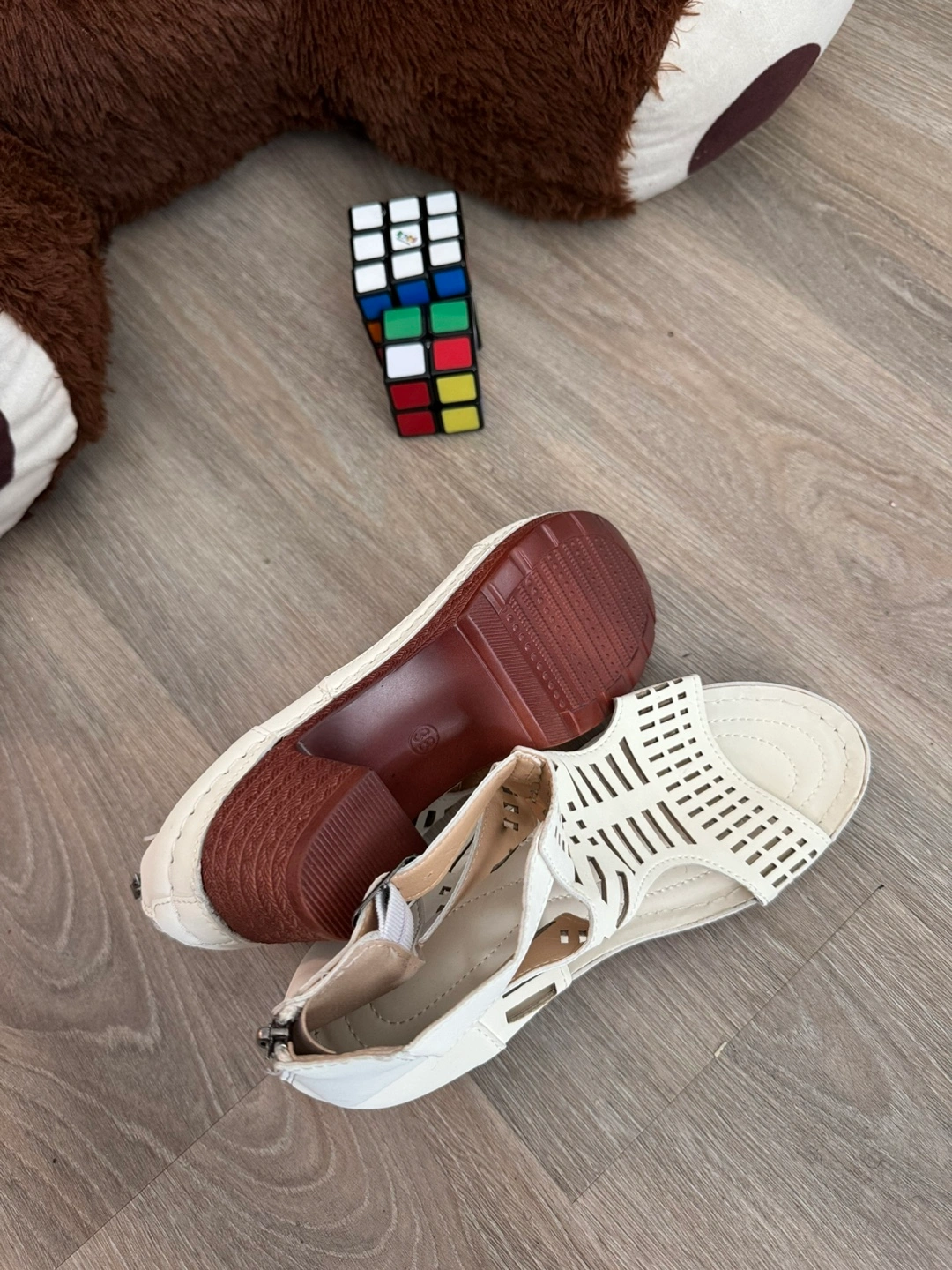 These white heeled sandals feature a stylish open-toe design with cut-out details. They have a side zipper and an adjustable buckle strap. The heel height is moderate, and the sole is a contrasting colour.