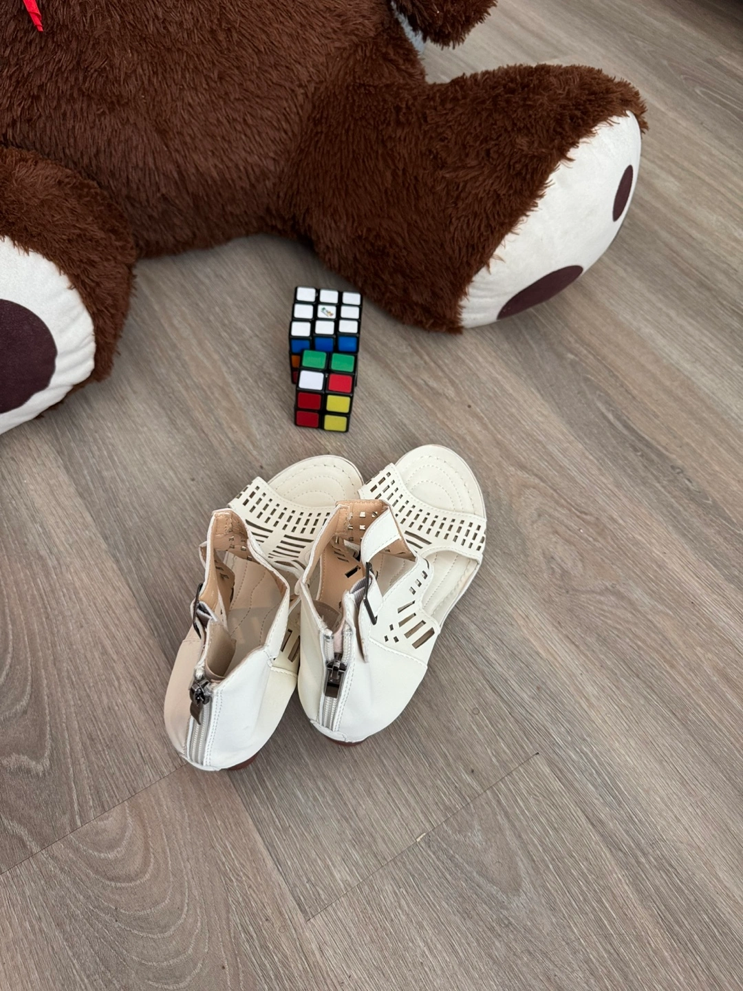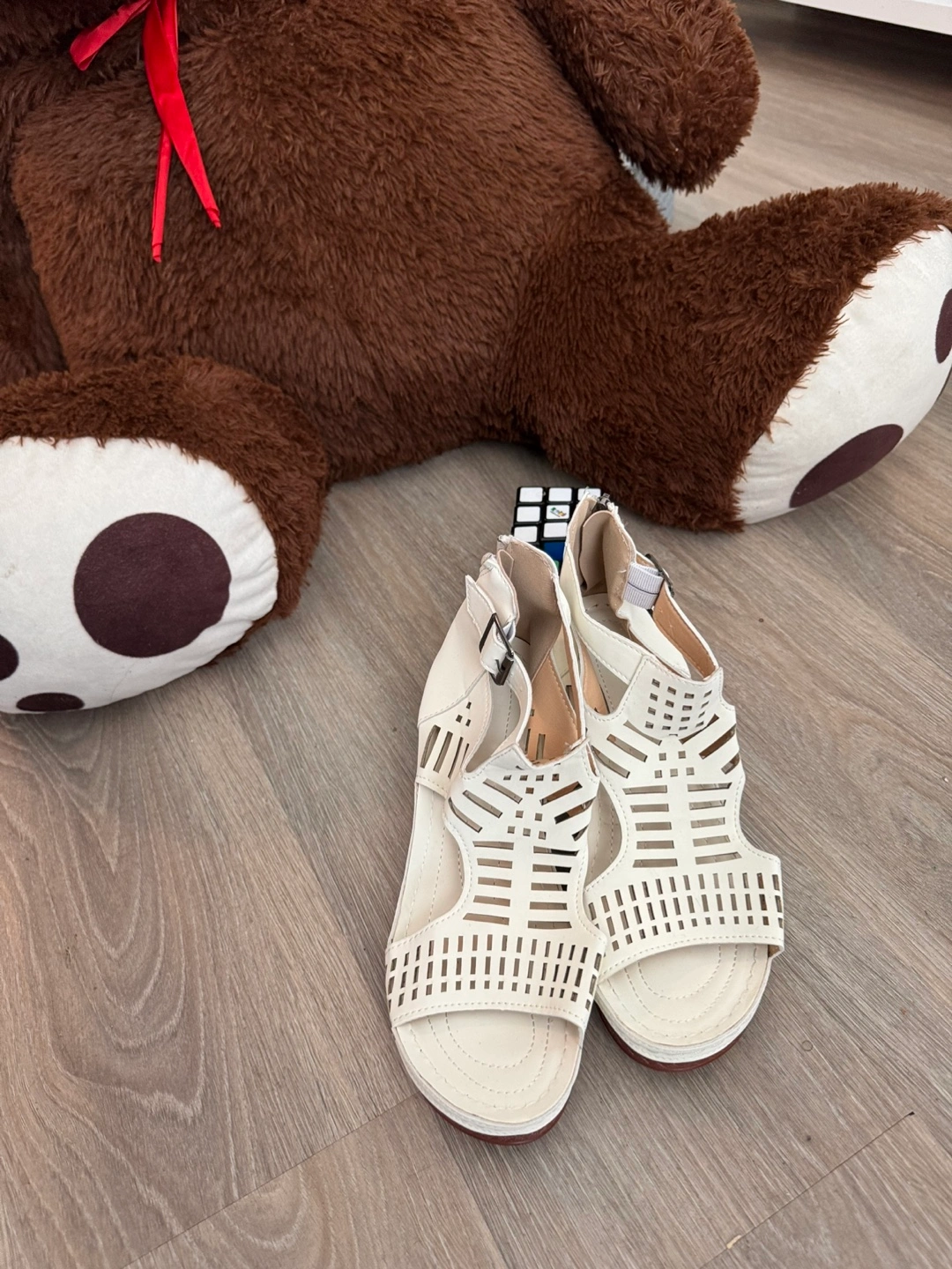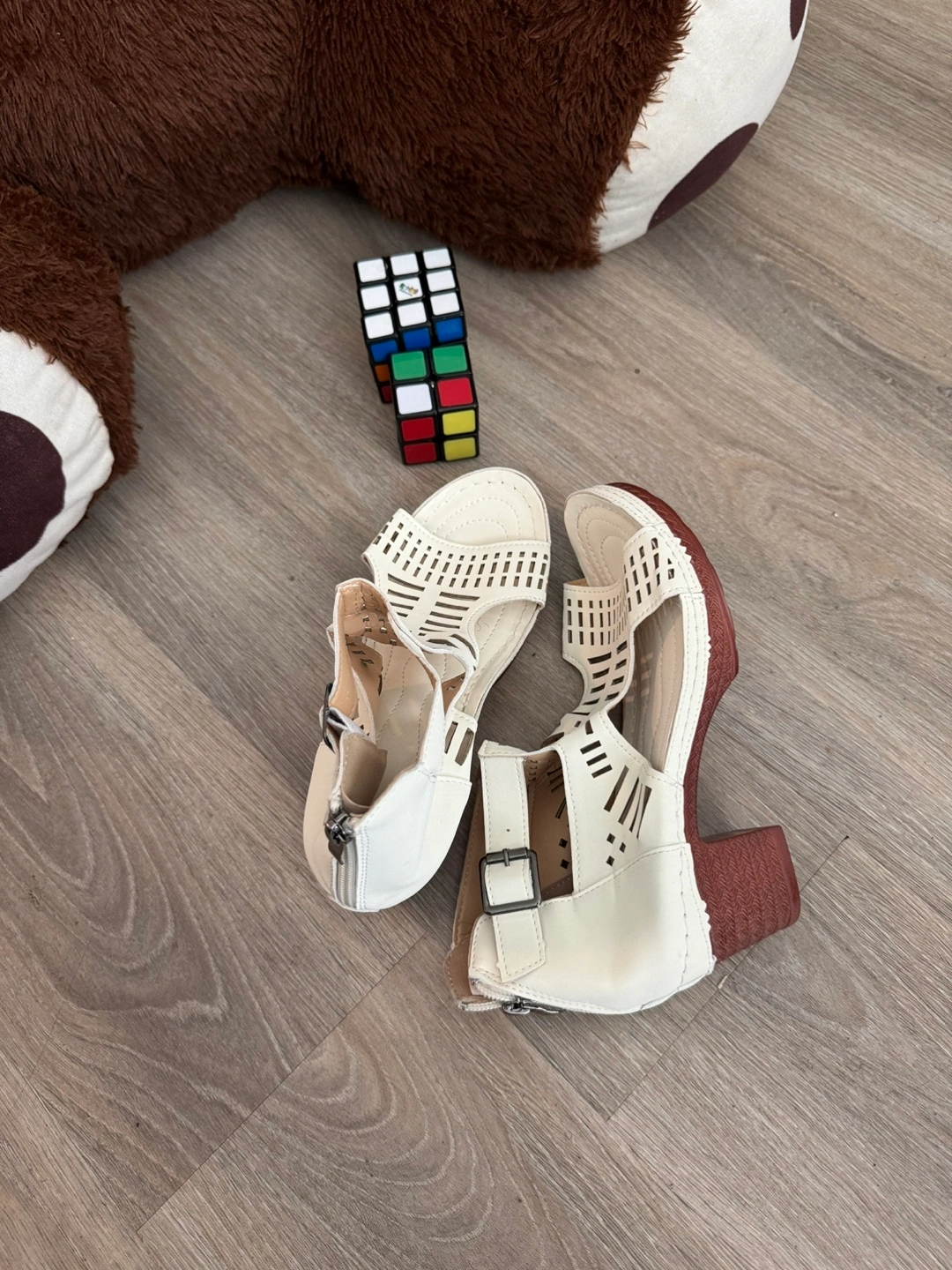 These white heeled sandals feature a stylish open-toe design with cut-out details. They have a side zipper and an adjustable buckle strap. The heel height is moderate, and the sole is a contrasting colour.