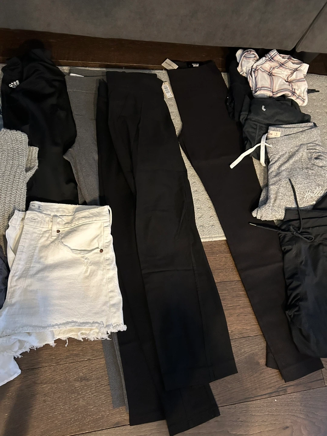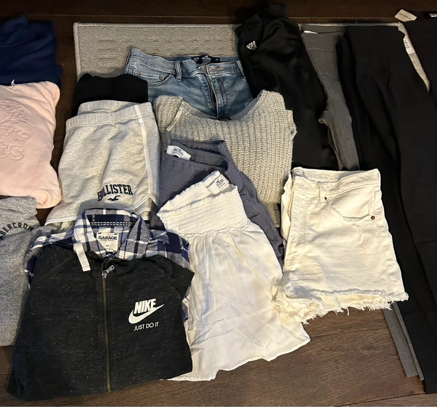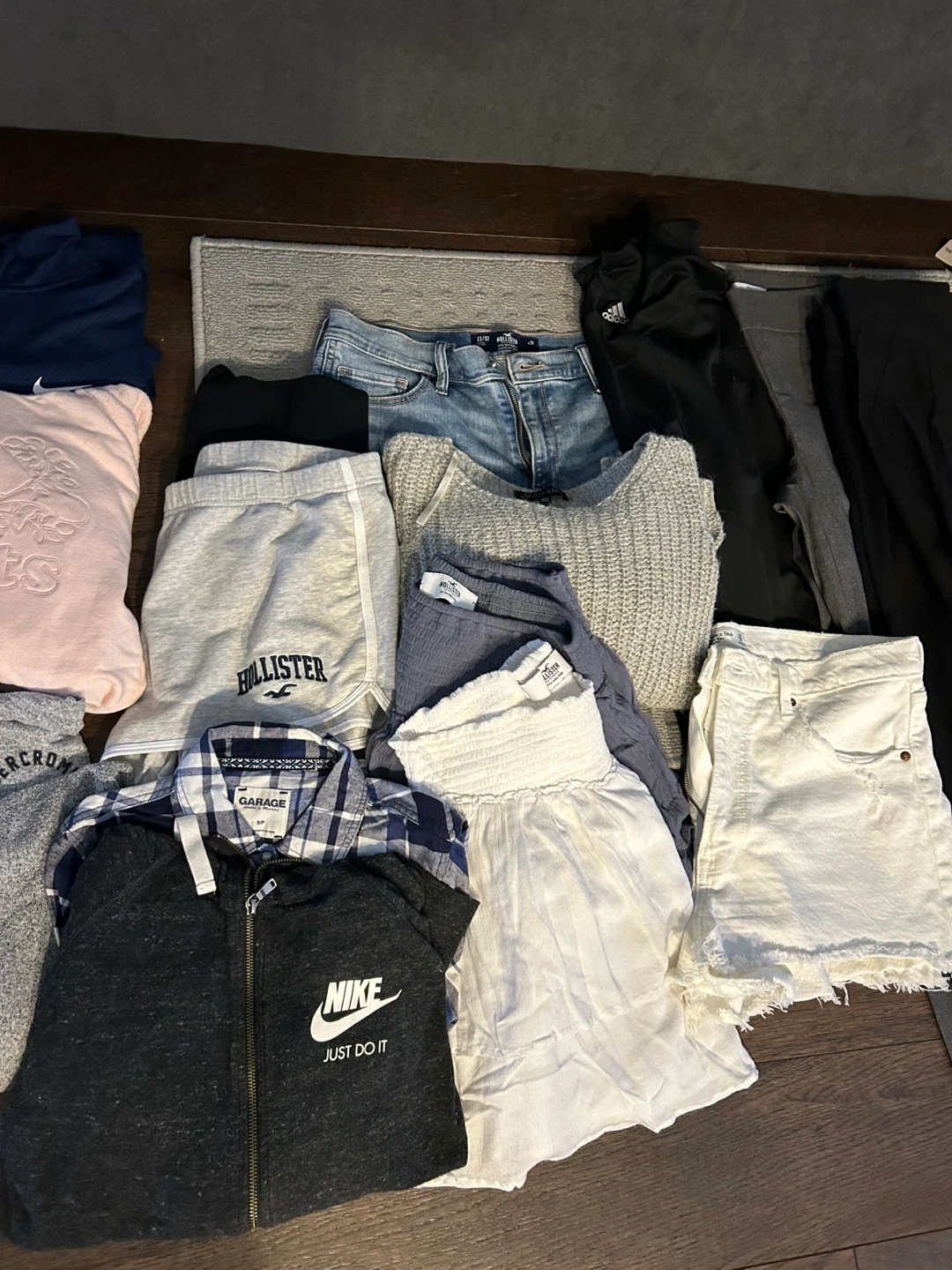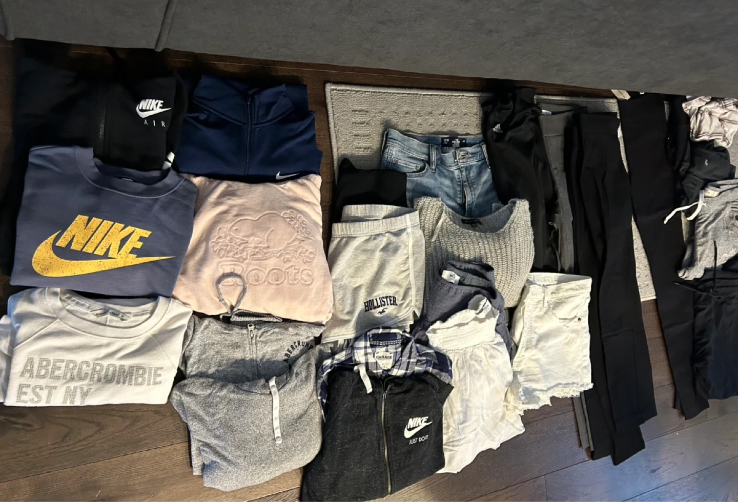 Bundle includes various tops and bottoms from brands like Nike, Roots, Hollister, and Abercrombie & Fitch. Items feature different colours and styles, perfect for everyday wear. Some pieces are sweaters, t-shirts, shorts, and brand new (with tags) pants.