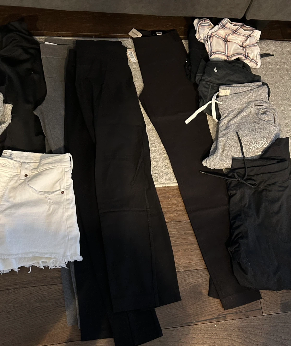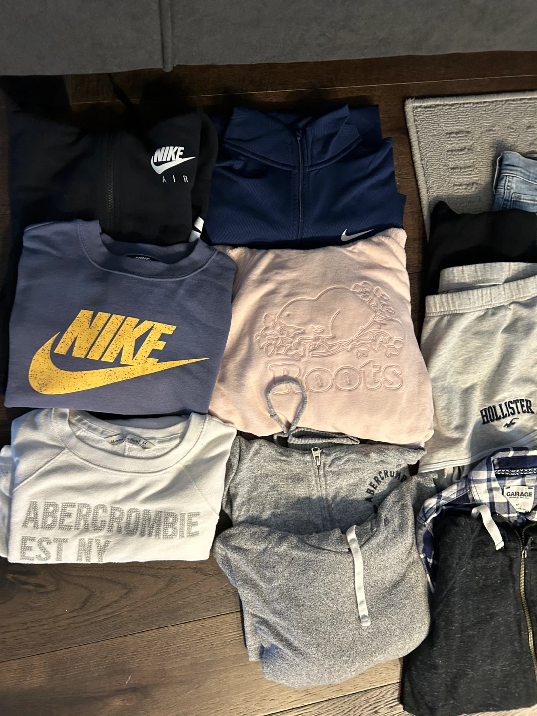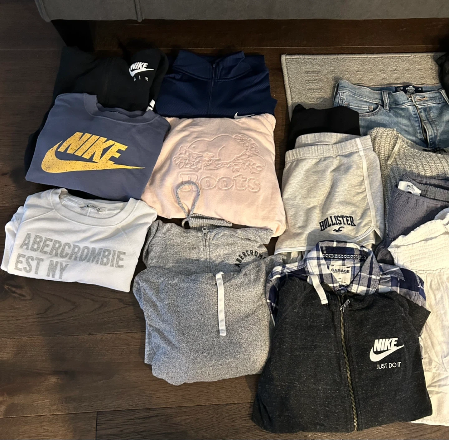 Bundle includes various tops and bottoms from brands like Nike, Roots, Hollister, and Abercrombie & Fitch. Items feature different colours and styles, perfect for everyday wear. Some pieces are sweaters, t-shirts, shorts, and brand new (with tags) pants.
