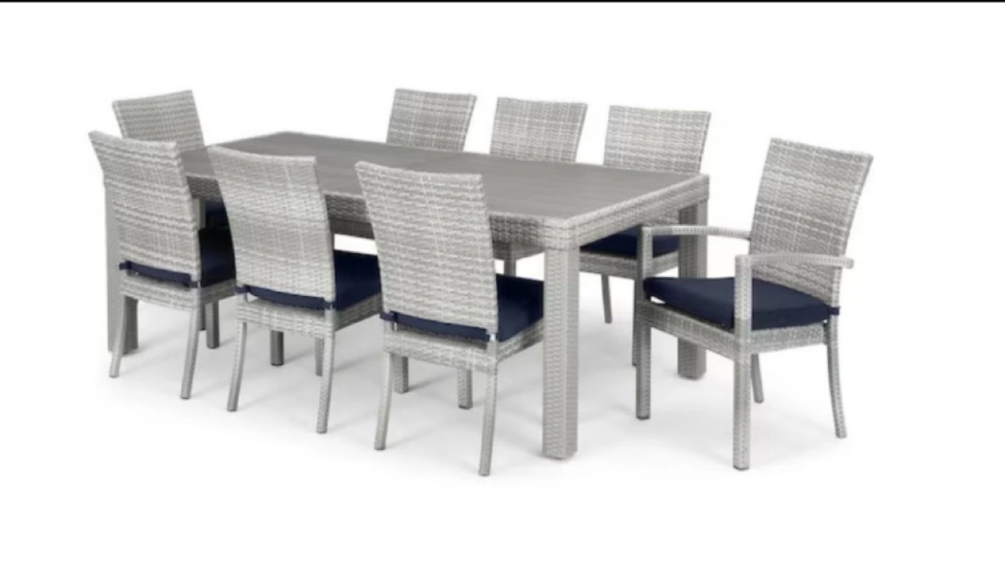 Selling RST Brands Cannes Gray Wicker Patio Dining Chairs with Blue Cushions. These are brand new in the box, plastic film still attached. The table is not included. If you look up the cost of RST products, you will find that this is about half of what they retail for. Details Inludes: Two (2) Armed Chairs, Six (6) Armless Chairs Color: Blue Frame is constructed with high quality, powder-coated aluminum for years of durability