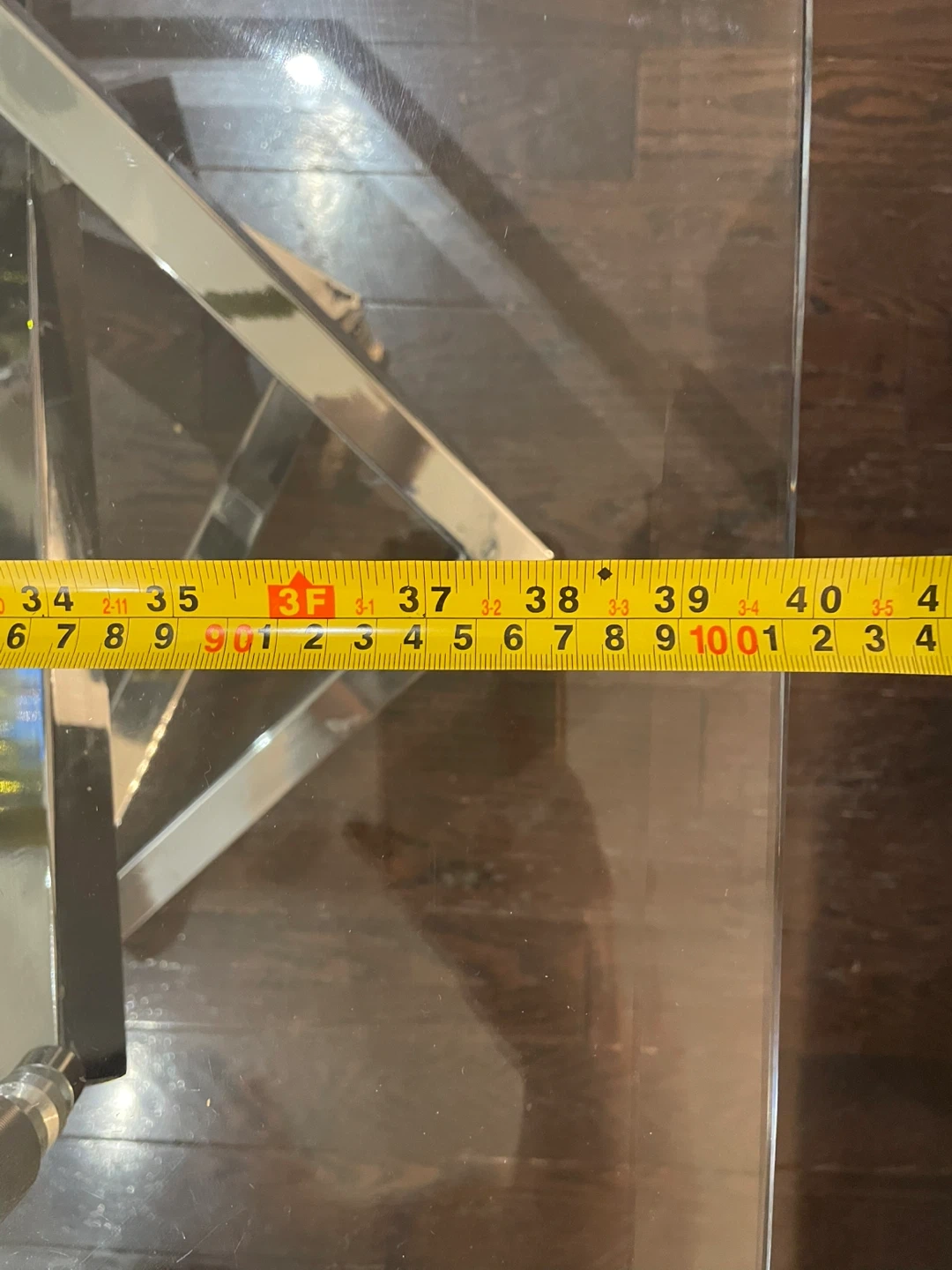 Selling a modern glass coffee table with a unique chrome base design. It has an octagon shape and measures approximately 44 inches across. Minor wear and tear - see last picture.