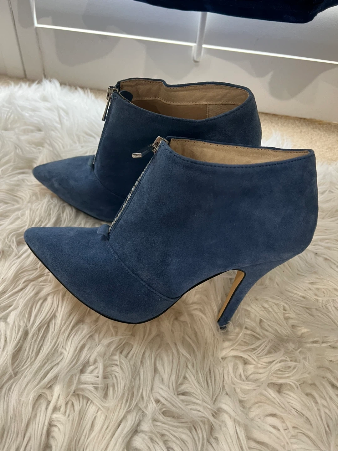These stylish ALDO ankle boots are a beautiful blue suede. They feature a pointed toe and a convenient zipper closure. Heel height is approximately 3 inches.