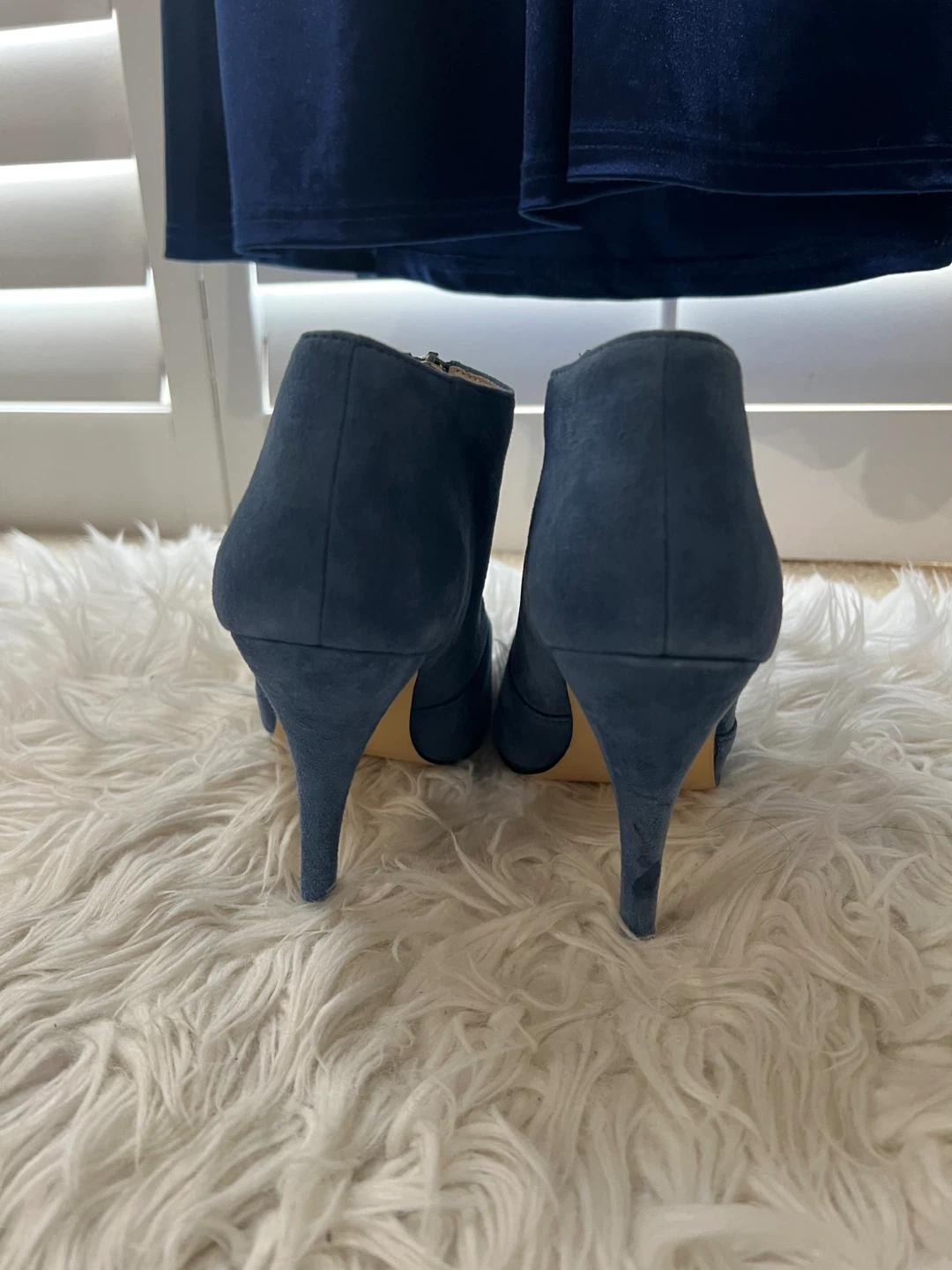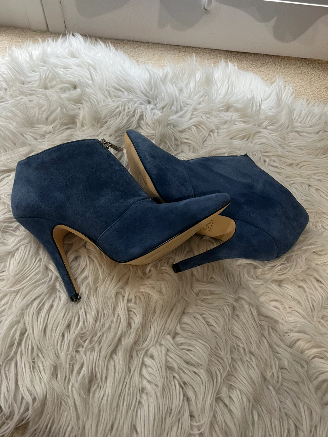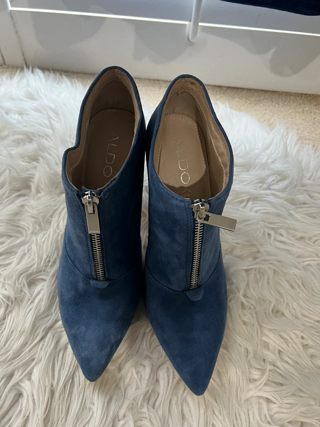 These stylish ALDO ankle boots are a beautiful blue suede. They feature a pointed toe and a convenient zipper closure. Heel height is approximately 3 inches.
