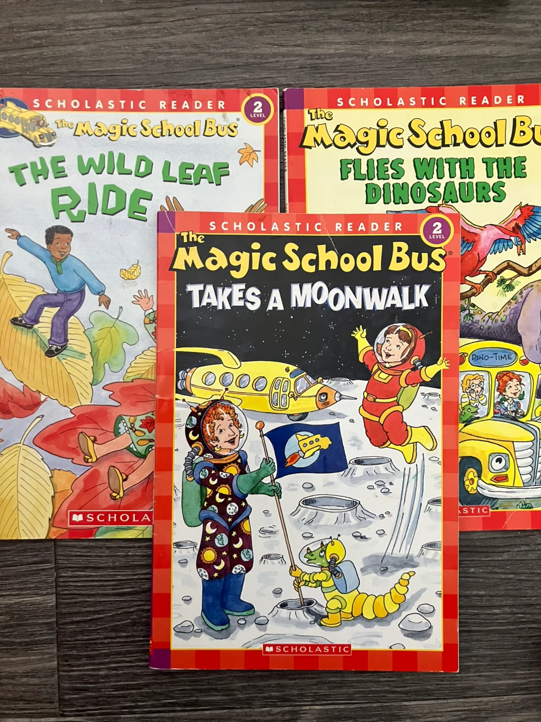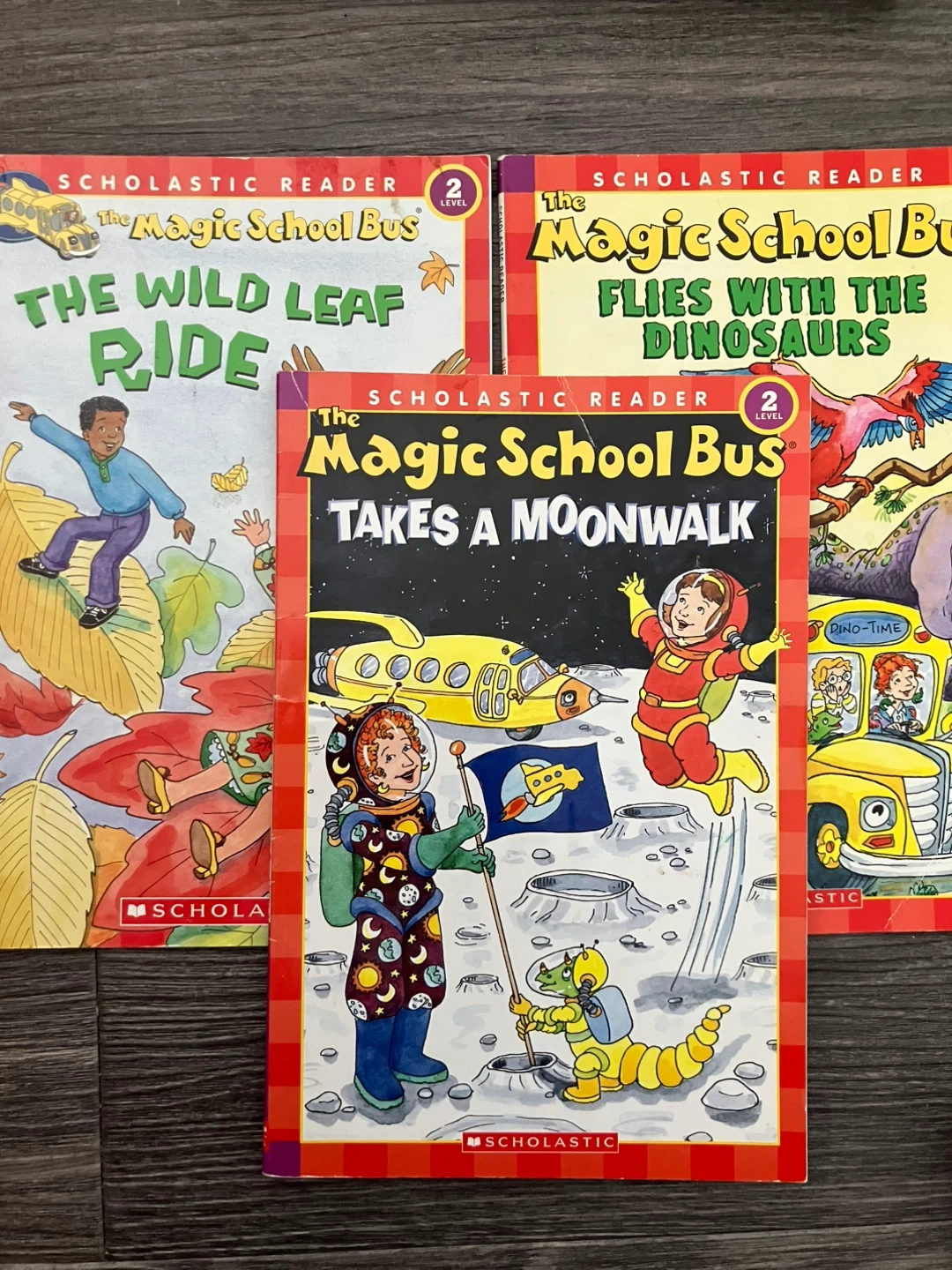 Collection of three Scholastic Reader books featuring The Magic School Bus. Titles include 'The Wild Leaf Ride', 'Flies With The Dinosaurs', and 'Takes A Moonwalk'. These are Level 2 readers.