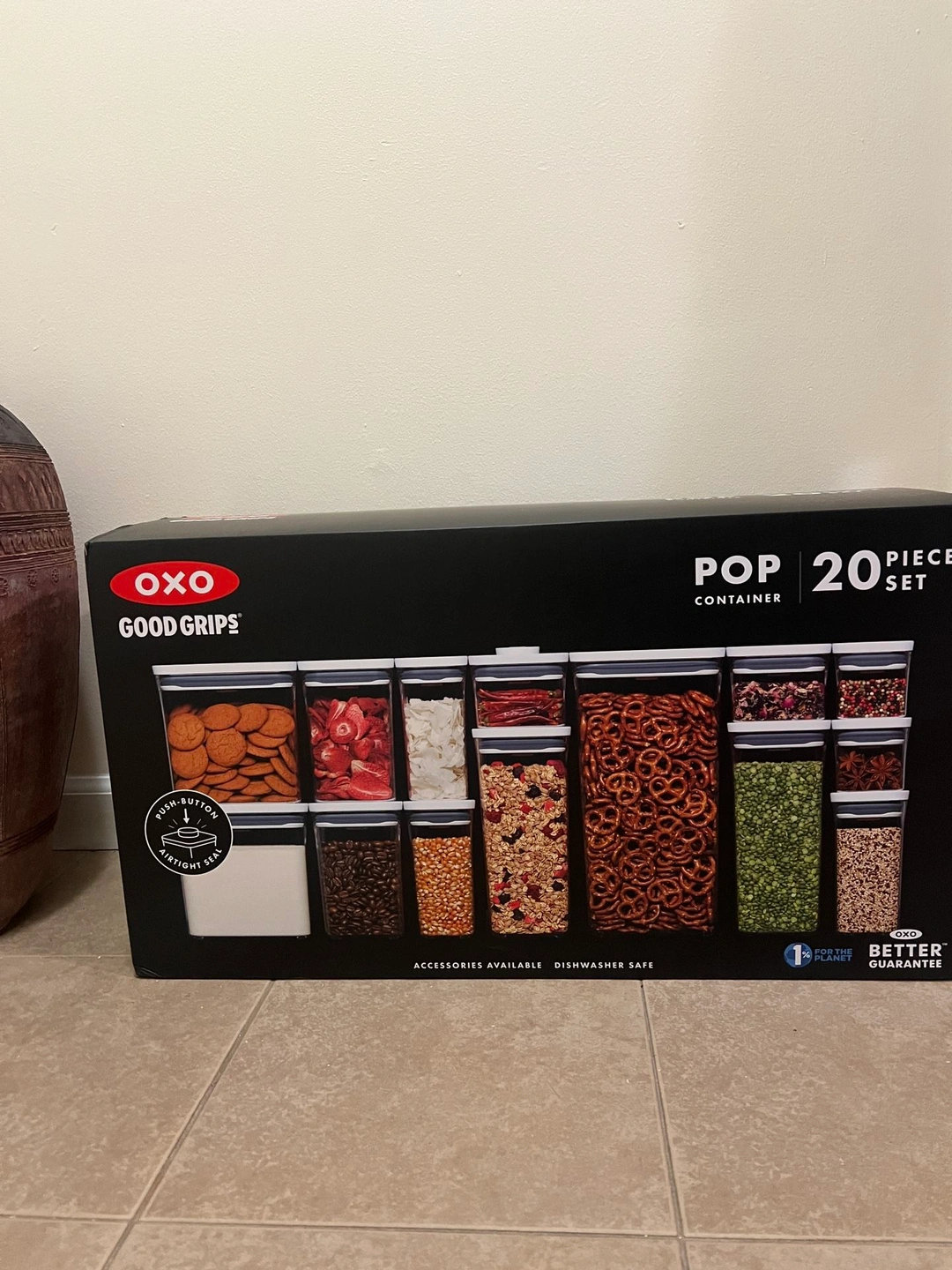 This is a brand new, never-used 20-piece set of OXO POP containers. They are airtight, stackable, and have a unique push-button mechanism for easy opening and closing. Perfect for organizing your pantry staples like flour, sugar, pasta, cereal, and more. The set includes various sizes to fit all your storage needs.