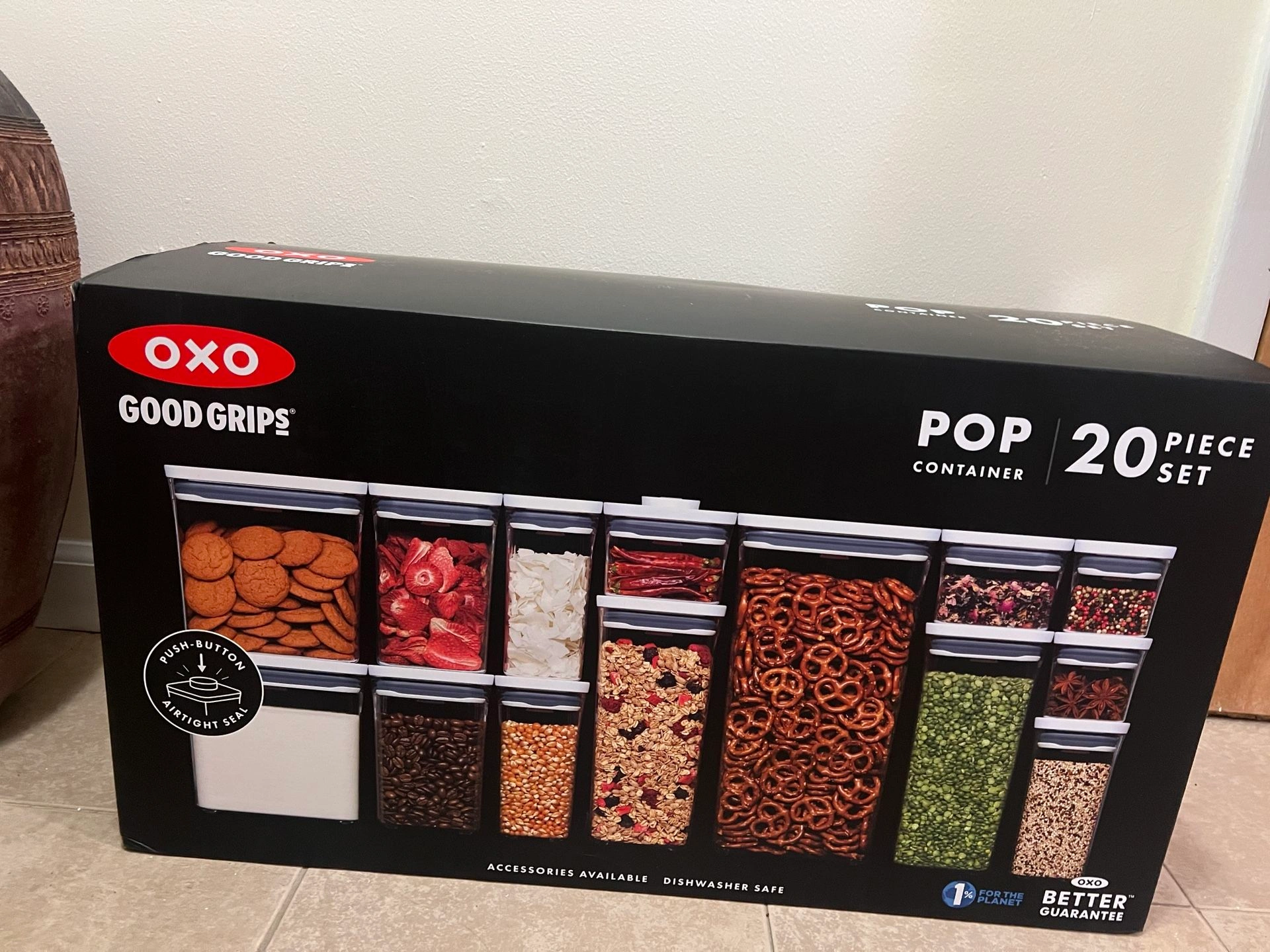 This is a brand new, never-used 20-piece set of OXO POP containers. They are airtight, stackable, and have a unique push-button mechanism for easy opening and closing. Perfect for organizing your pantry staples like flour, sugar, pasta, cereal, and more. The set includes various sizes to fit all your storage needs.
