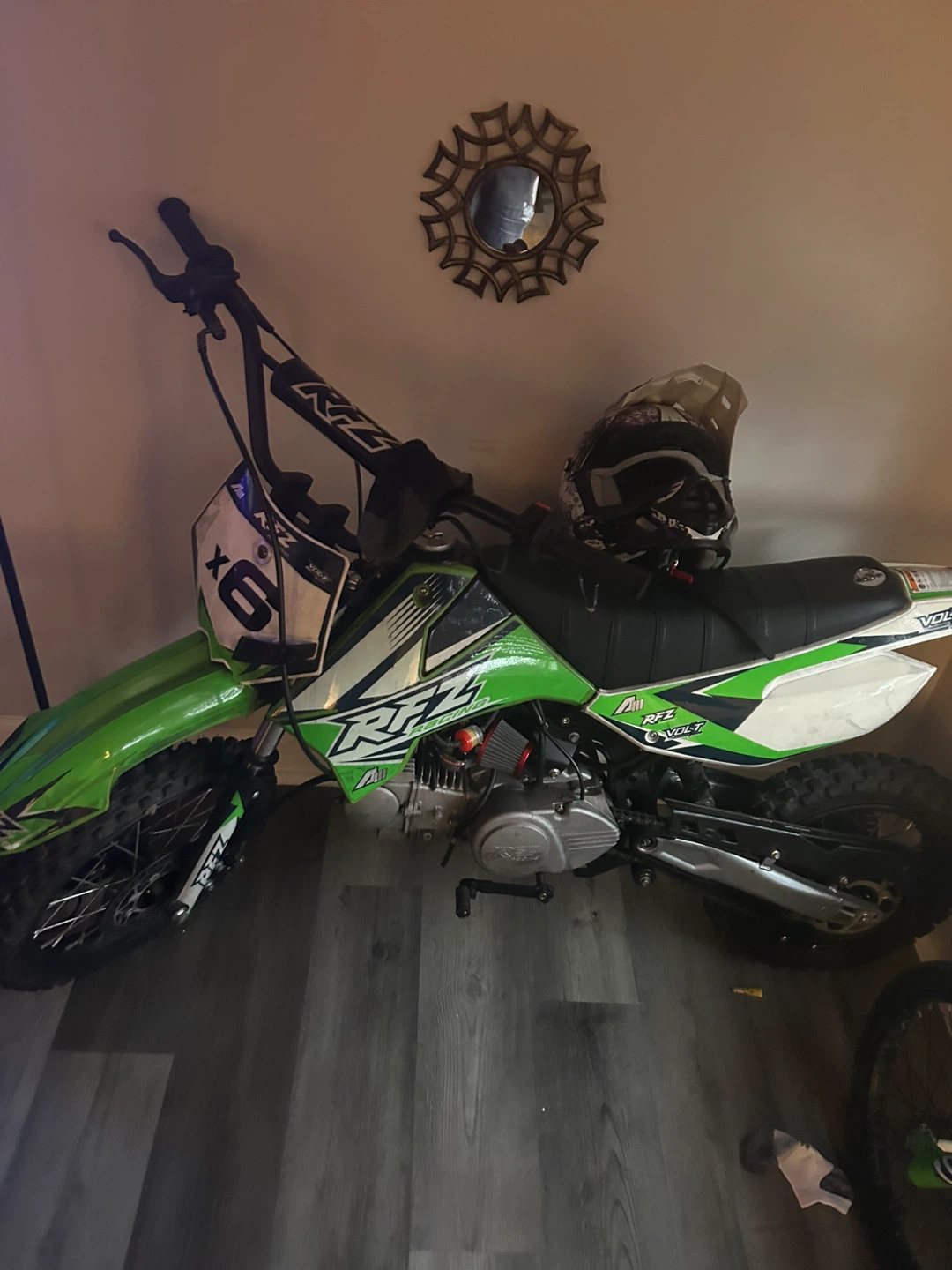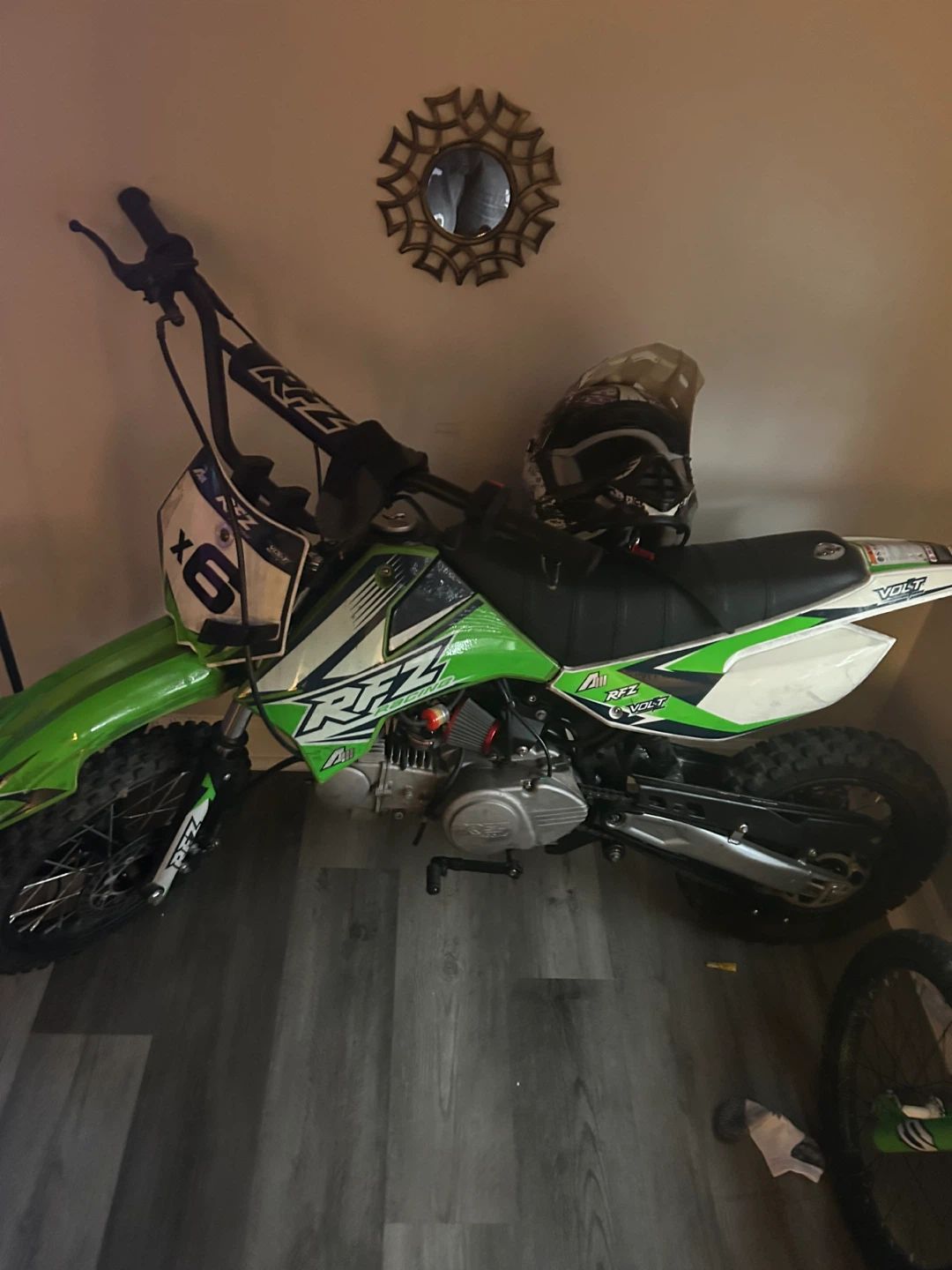 This is a RAZ "RFZ" dirt bike, suitable for off-road adventures. It includes a helmet for safety. The bike is green and white.