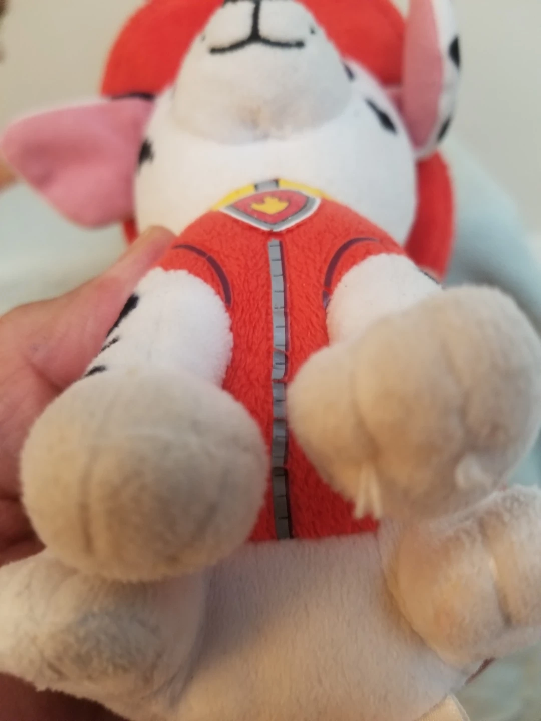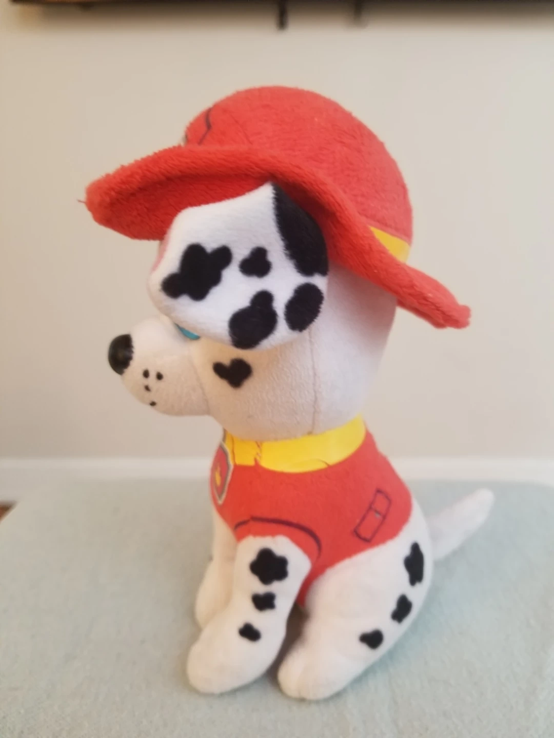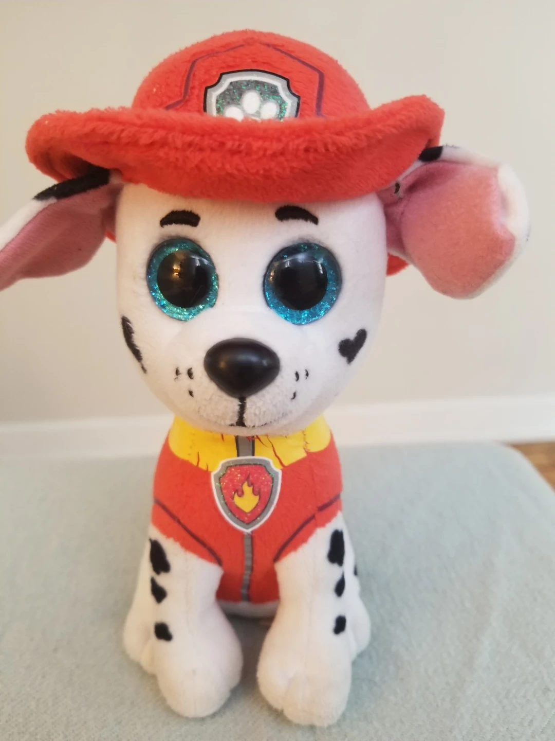 This is a soft plush toy of Marshall from Paw Patrol. It features his signature firefighter hat and uniform. It's made from cuddly material, perfect for any Paw Patrol fan! OBO