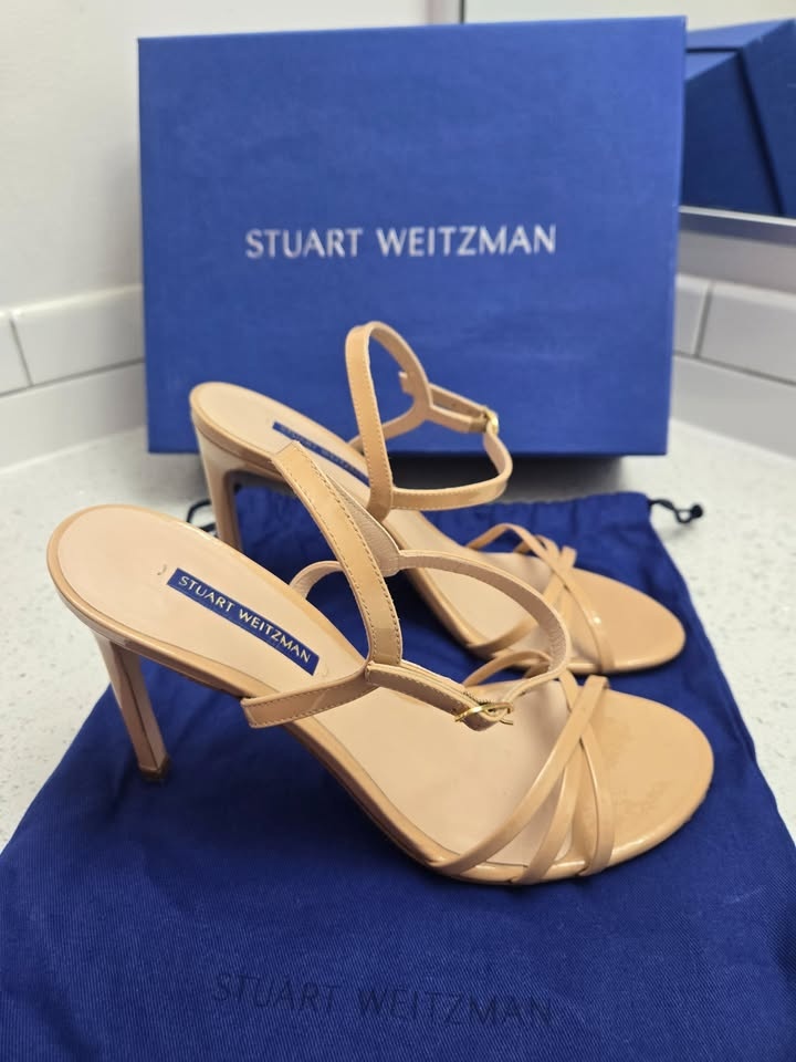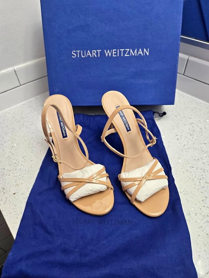 Stuart Weitzman Starla 105 Adobe Patent Leather Heels. Original Price $545 (with taxes) Size 9M. Includes Dusting Bag & Original Box. Open toe, buckled ankle strap with elastic gore, crossover straps at toe. 4" heel. Leather upper, leather lining and sole. Made in Spain. Only worn three to four times - the only marks on them are on the bottom sole (last picture). Selling them as I can't wear them since I had foot surgery.
