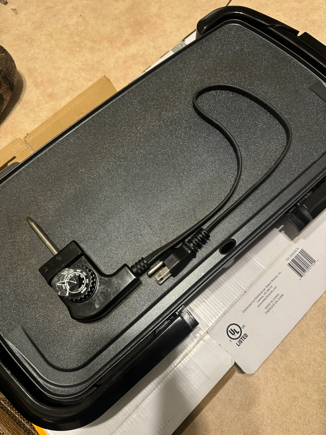 Electric griddle. Includes power cord. Has a temperature control knob. Has non-stick surface. Includes removable drip tray. Made in China.