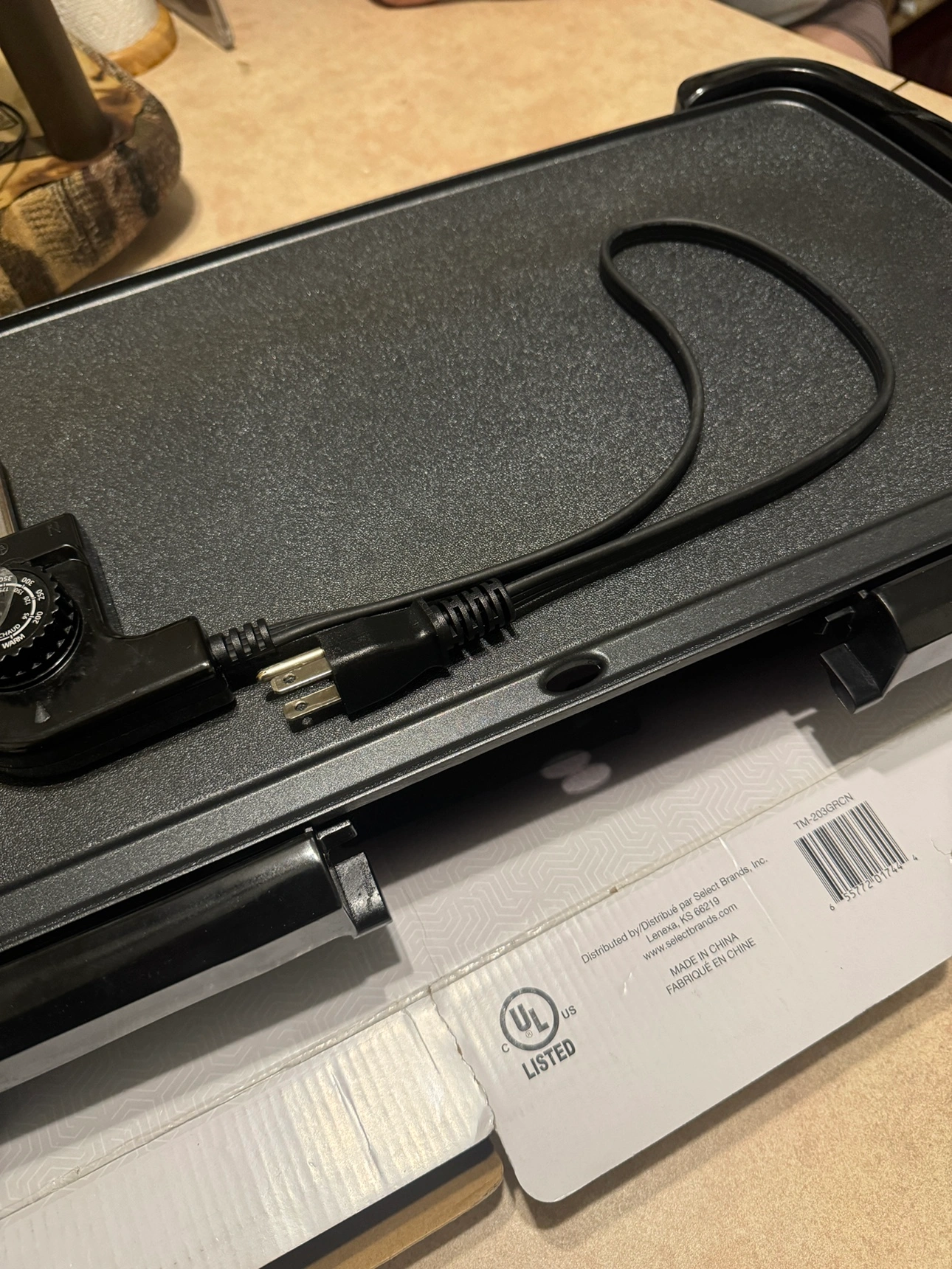 Electric griddle. Includes power cord. Has a temperature control knob. Has non-stick surface. Includes removable drip tray. Made in China.