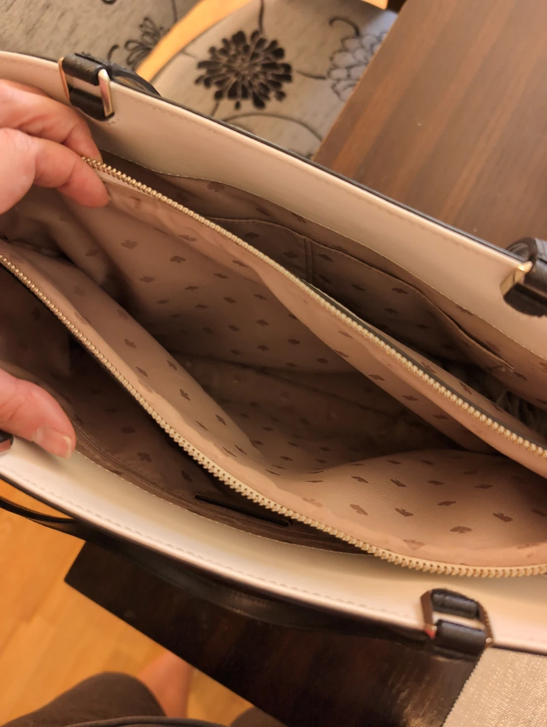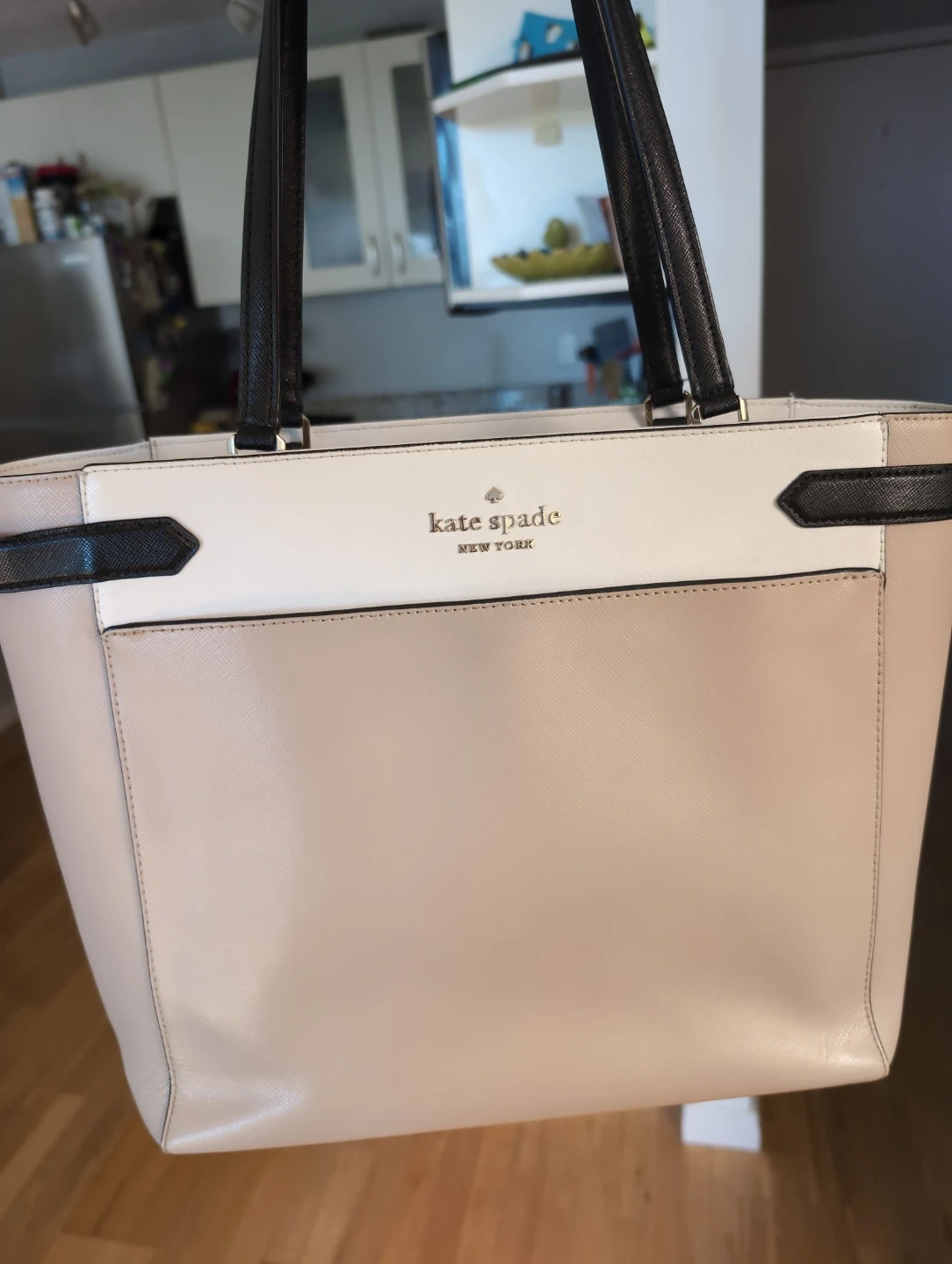 This Kate Spade tote bag is a lovely pinky-beige with black and white accents. It's a classic design with interior pockets and a middle zip closure, easily organizing and securing your belongings.