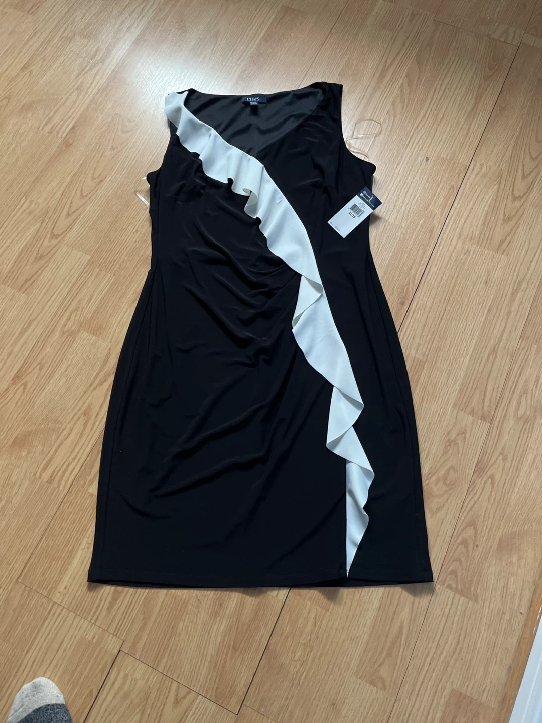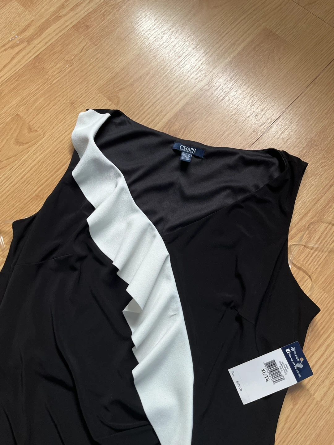 This Chaps dress is black with a white ruffle detail down the front. It's a sleeveless design. Size is XL/TG.