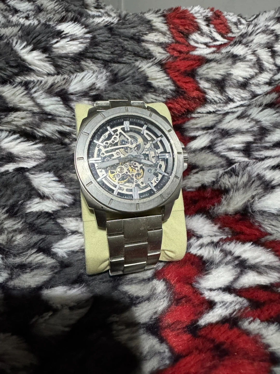 Selling a Fossil automatic skeleton watch. The watch is in good condition and features a stainless steel band. It's a stylish timepiece that showcases the intricate inner workings of the watch movement. Comes with box