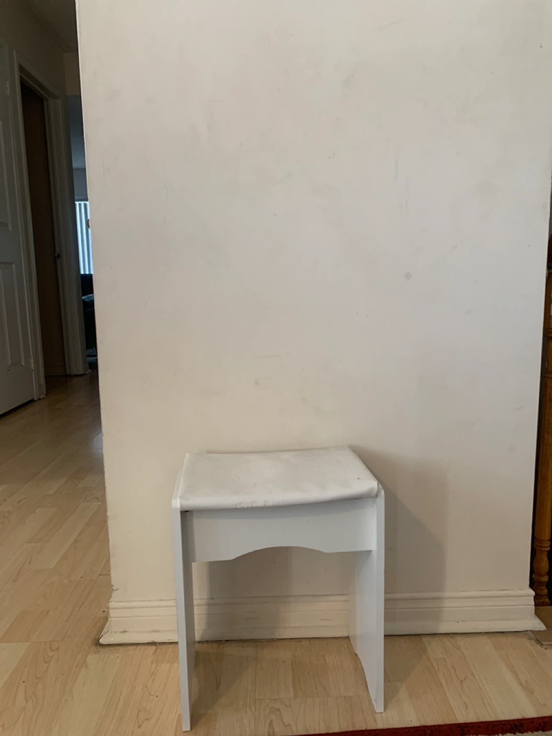 A simple white vanity stool. It's made of wood and has a curved seat. This stool is perfect for a vanity or as an extra seat.