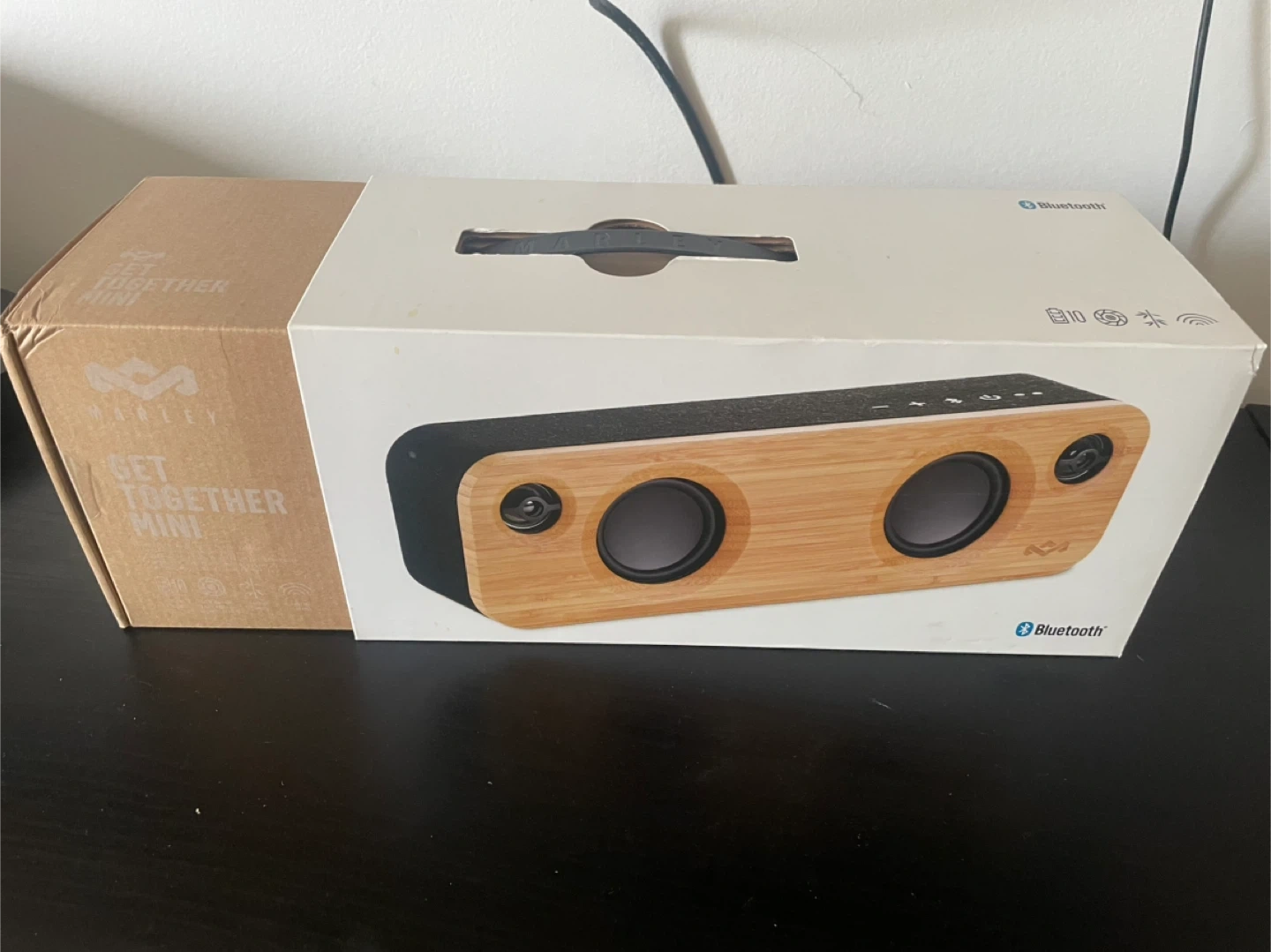 House of Marley Get Together Mini Bluetooth speaker. It's made with sustainable materials and connects wirelessly. This speaker is great for listening to music indoors or outdoors.