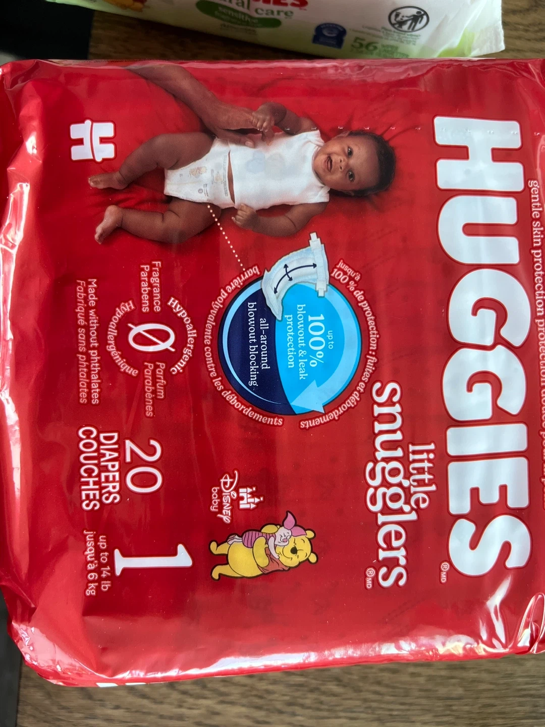 Huggies Little Snugglers diapers in size 1. There are 20 diapers in this pack. They're made without phthalates and parabens. Suitable for babies up to 14 lbs or 6 kg.