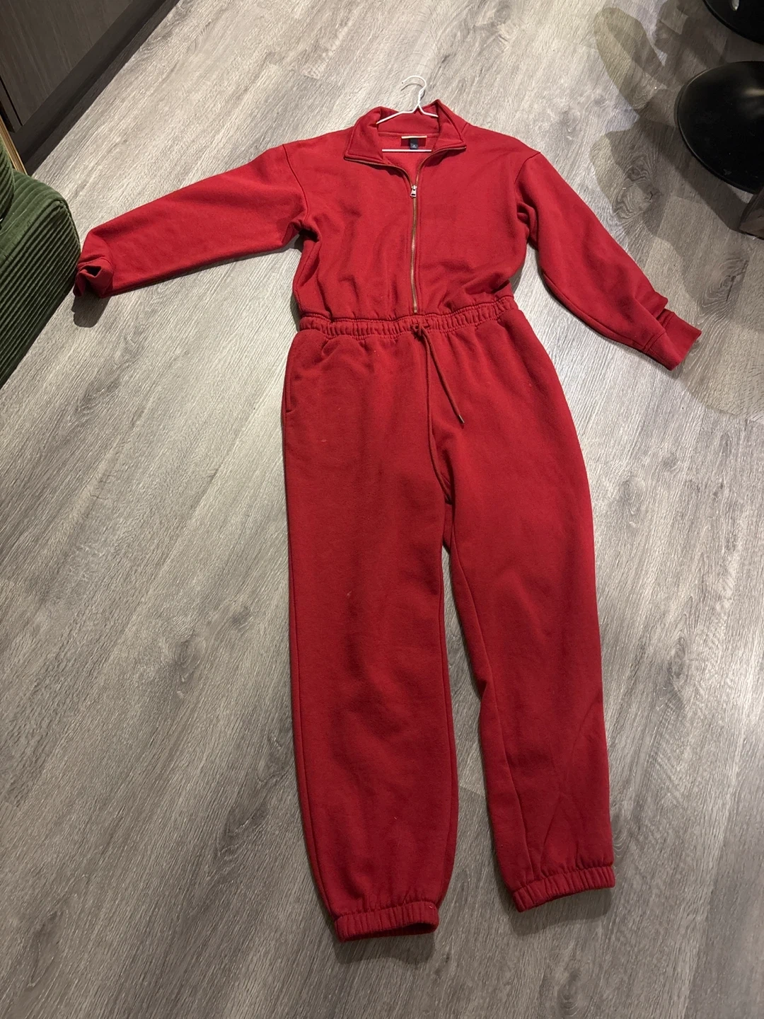Selling a comfy red jumpsuit! It features a zip-up front and a drawstring waist. Perfect for lounging or casual outings