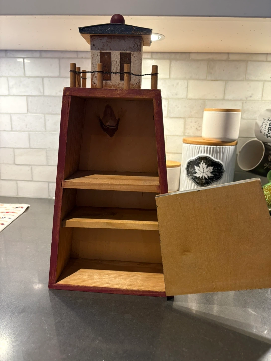 Cute wooden lighthouse shelf, perfect for adding a nautical touch to any room! It has a small cabinet at the bottom with a sailboat design.