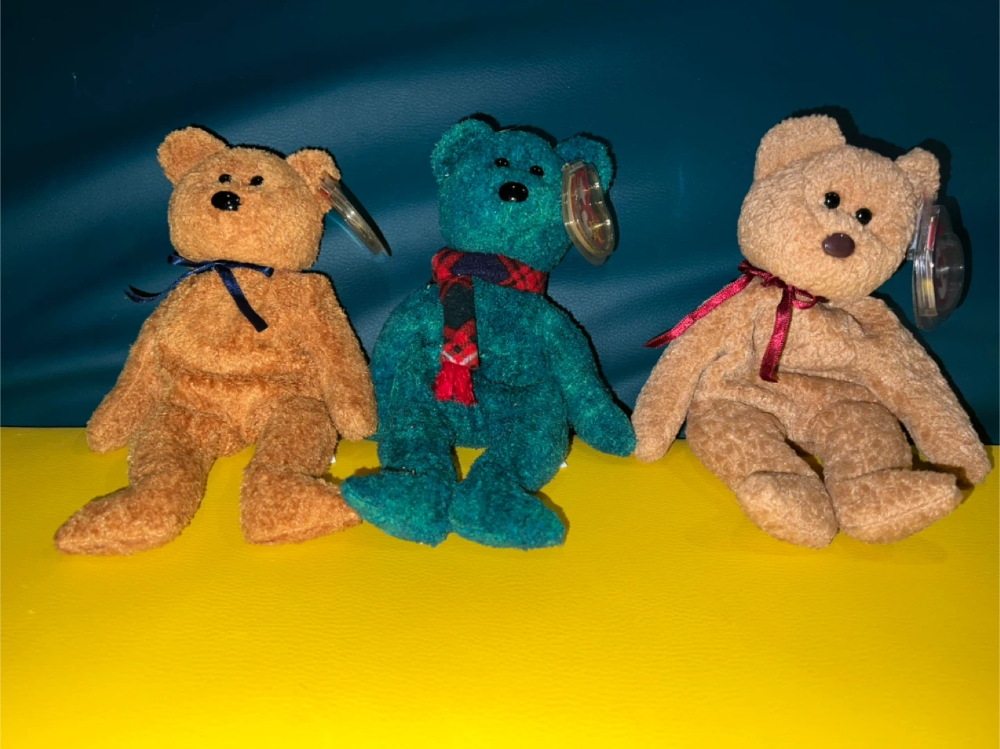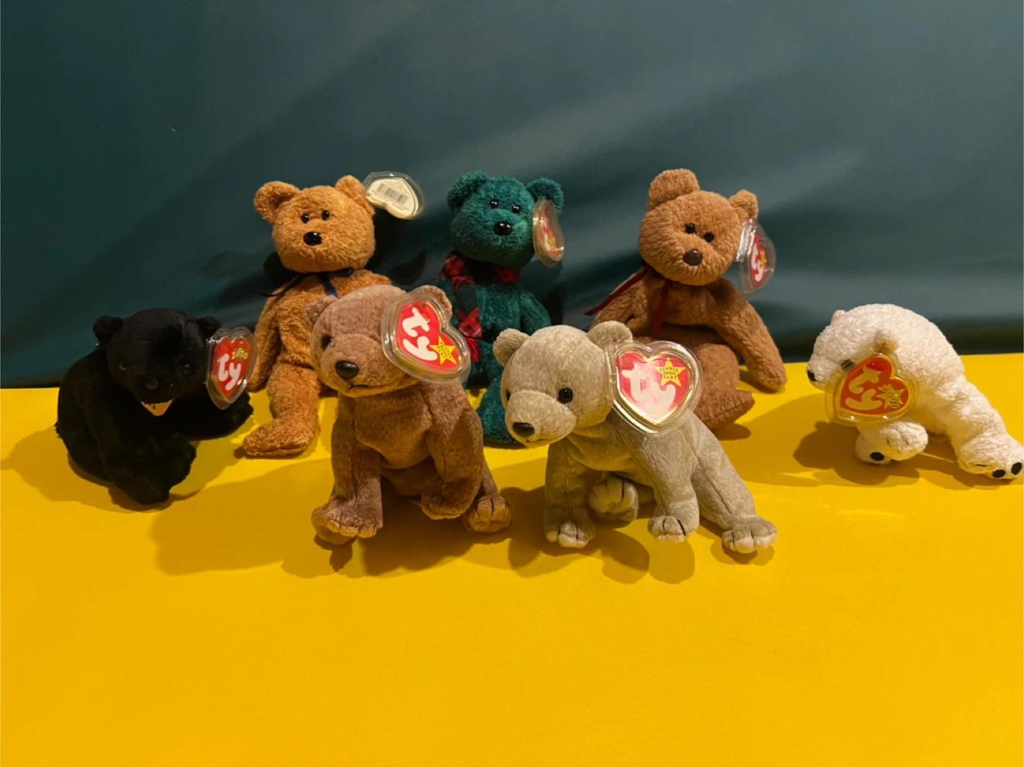 Collection of Ty Beanie Babies Teddy and Bear Collectibles. Rare and vintage, great condition, all with tags, protected tags even. This lot includes Aurora, Cinders, Almond, Pecan, Fuzz, Curly and Wallace!