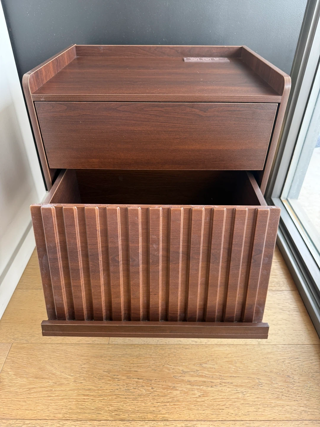This dark wood nightstand has two drawers and a convenient power outlet on top. There is an LED light strip included that lights the bottom drawer from the top. It's a practical piece for any bedroom. The drawer front features a fluted design, adding a touch of modern style. It's perfect for keeping your essentials close by your bedside.