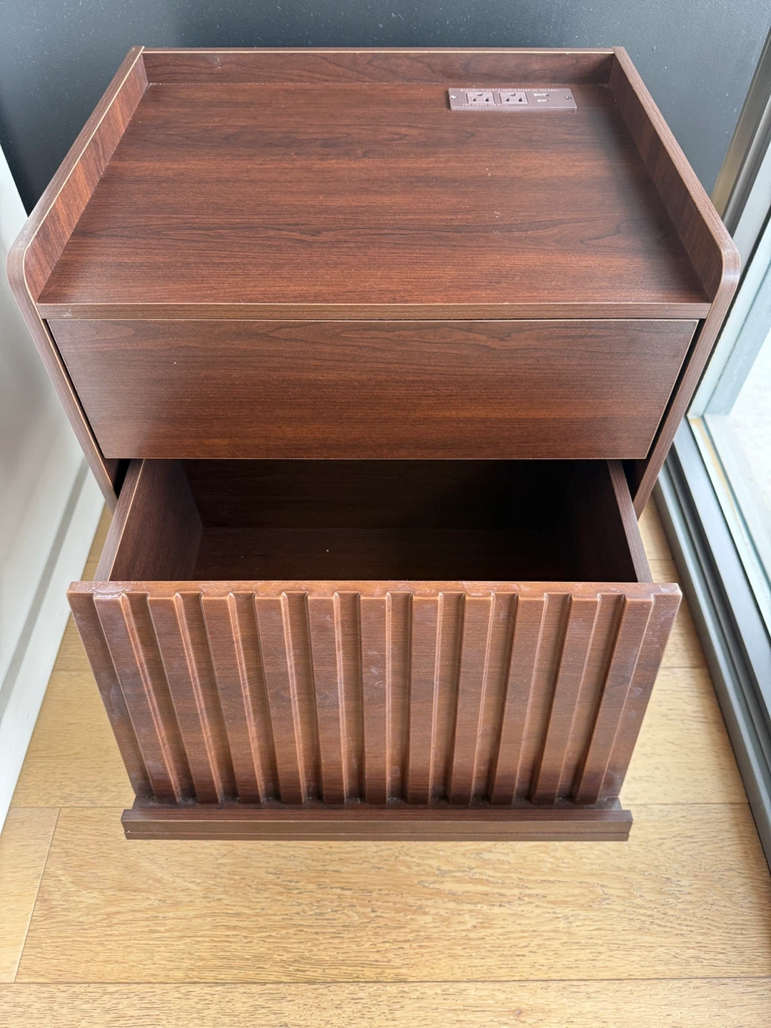 This dark wood nightstand has two drawers and a convenient power outlet on top. There is an LED light strip included that lights the bottom drawer from the top. It's a practical piece for any bedroom. The drawer front features a fluted design, adding a touch of modern style. It's perfect for keeping your essentials close by your bedside.