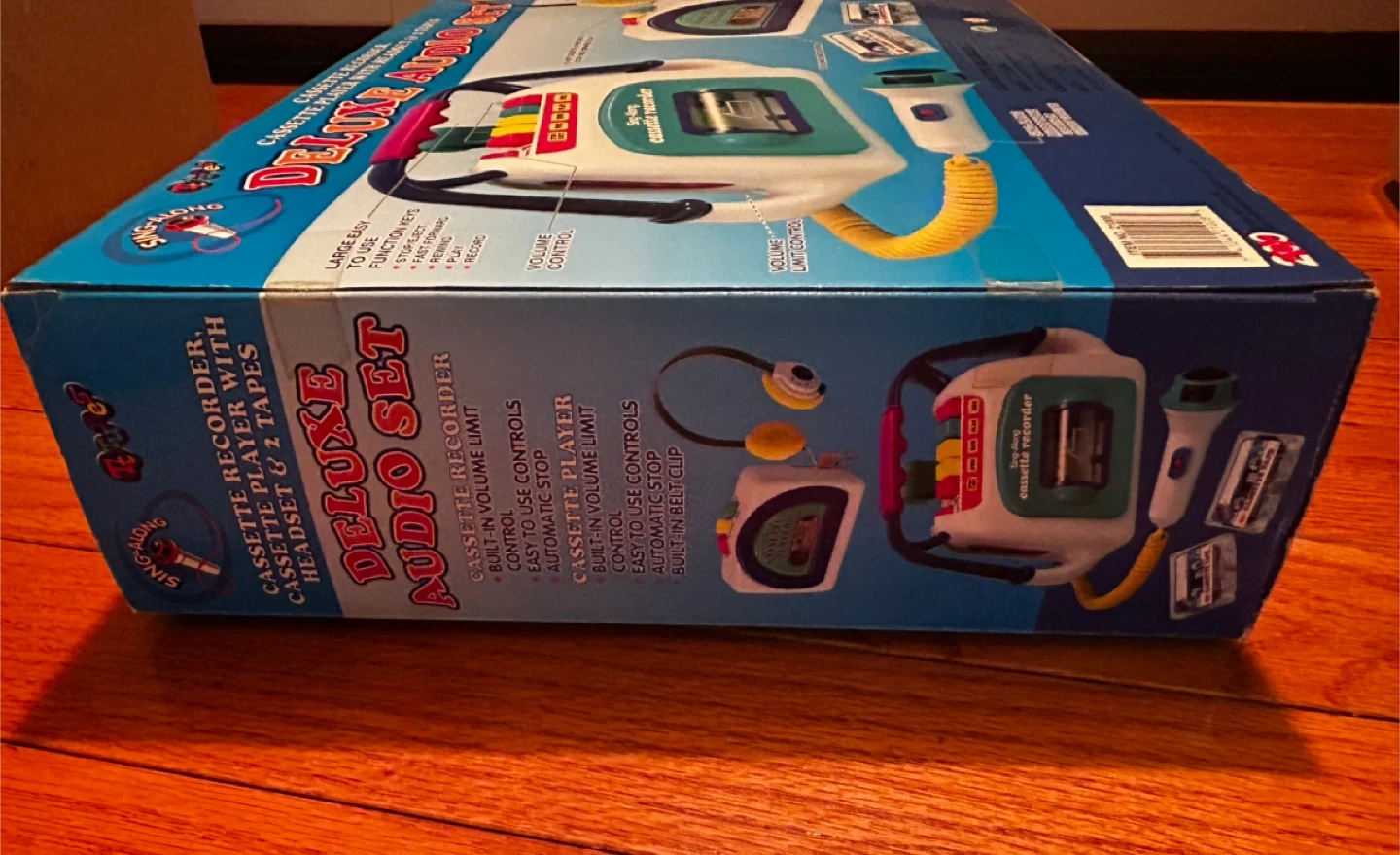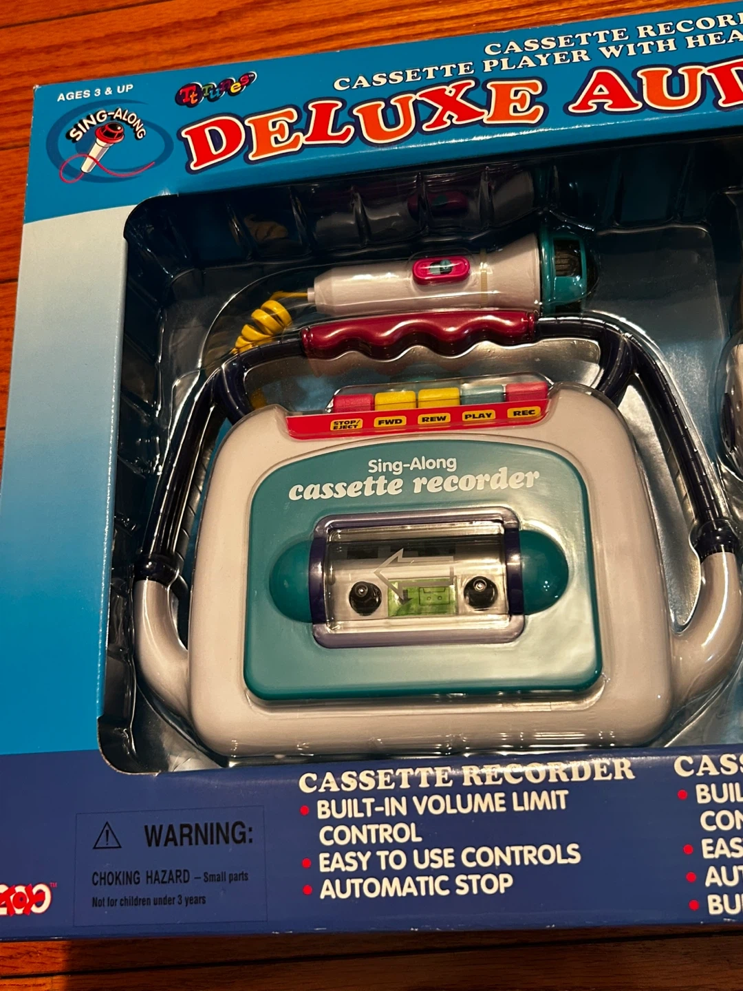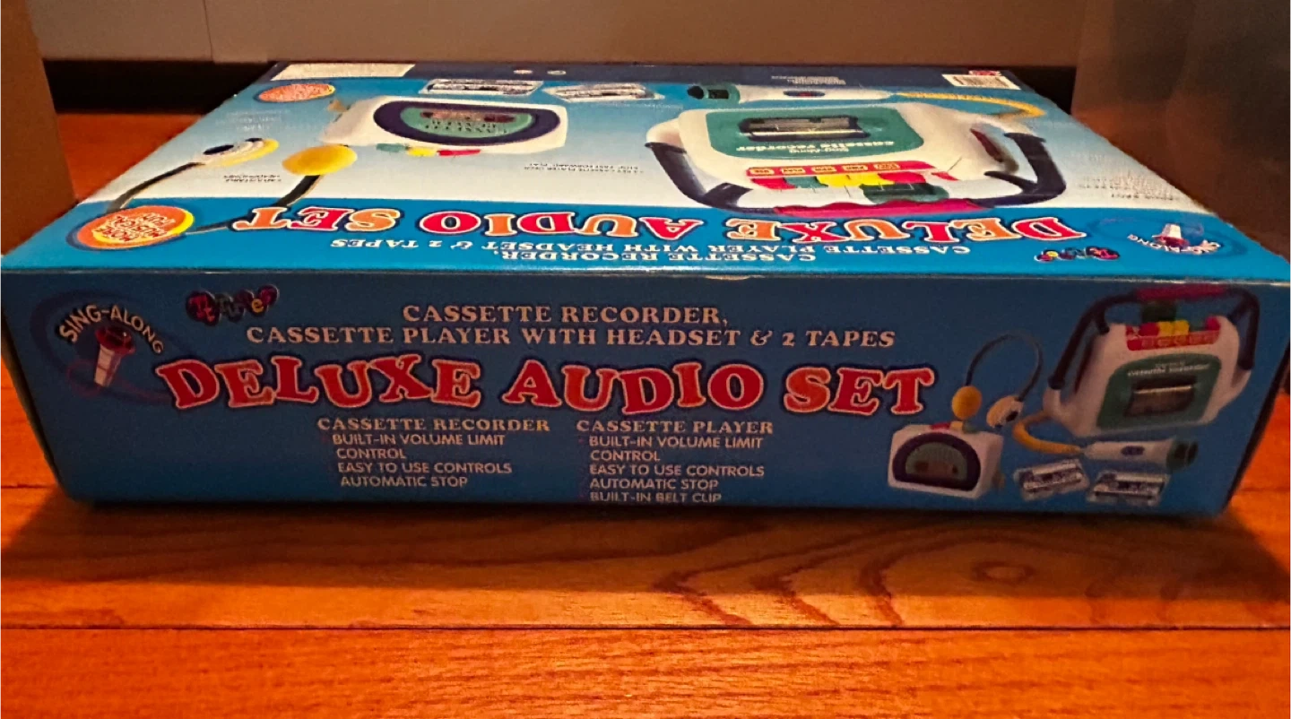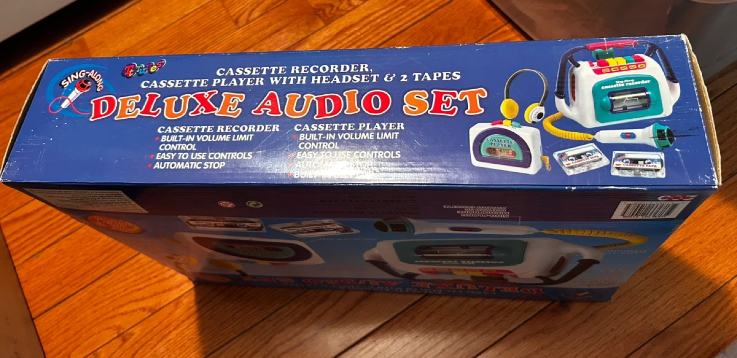 Fun early-2000s kids audio toy set by 200 Toys Inc. This Sing-Along Deluxe Audio Set includes a cassette recorder, cassette player, headset microphone, and toy tapes — all in the original retail box.
