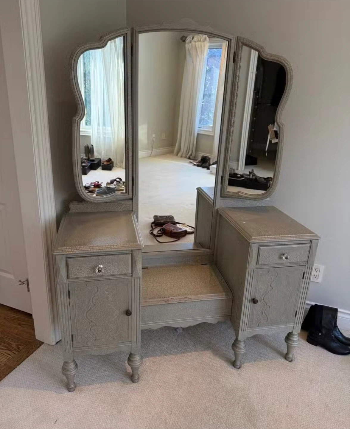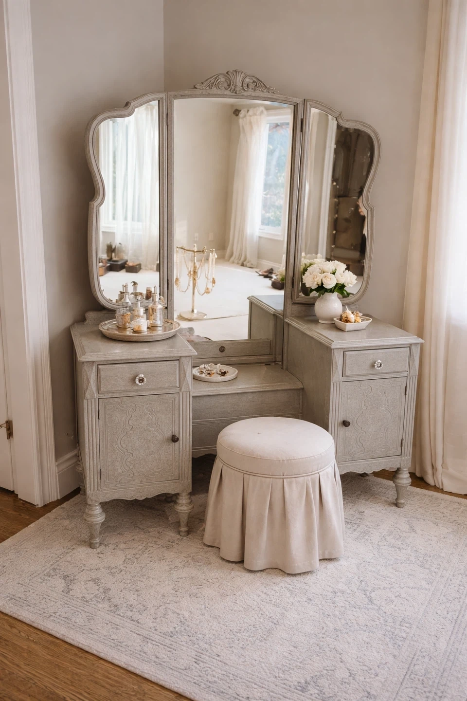A lovely vintage vanity dresser with a triple mirror and a matching upholstered stool. It's painted a soft grey and features ornate detailing on the doors and drawers. This set includes two side cabinets and a central step-up area, offering ample storage and a charming place to get ready.