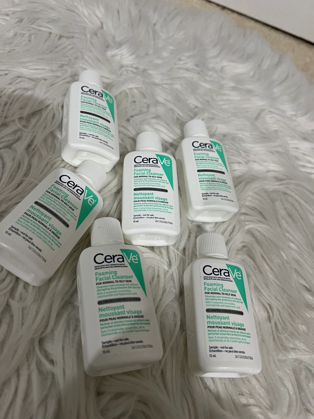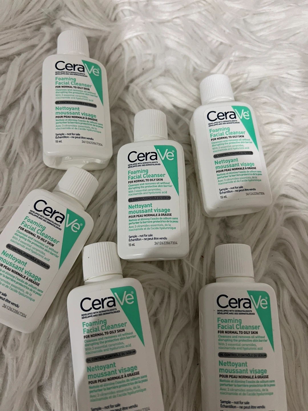 CeraVe Foaming Facial Cleanser bottles for normal to oily skin. Each bottle contains 15 mL. It's developed with dermatologists and contains 3 essential ceramides and hyaluronic acid.
