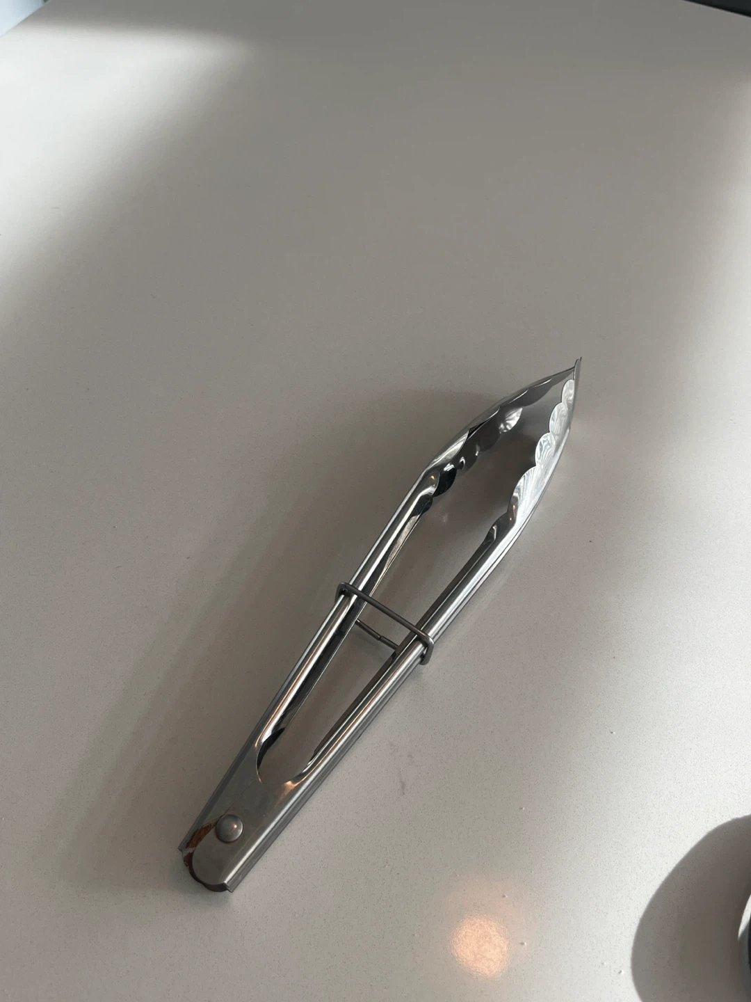 These are stainless steel kitchen tongs. They have a simple locking mechanism at the base for storage. Great for flipping food on the grill or serving salad!
