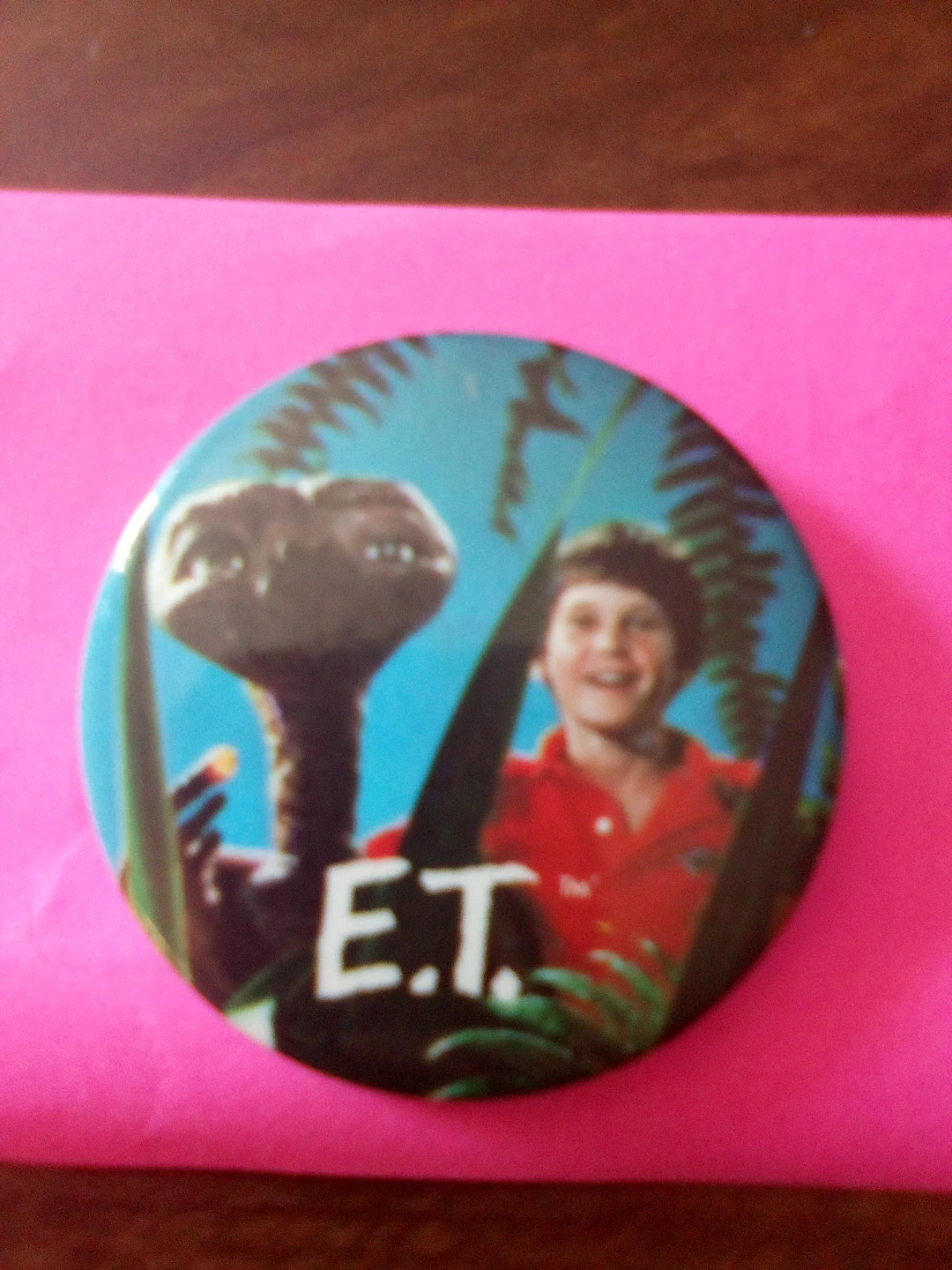 This is a vintage pin featuring E.T. and a boy. It's a fun collectible for fans of the classic movie. It's round and made of metal.