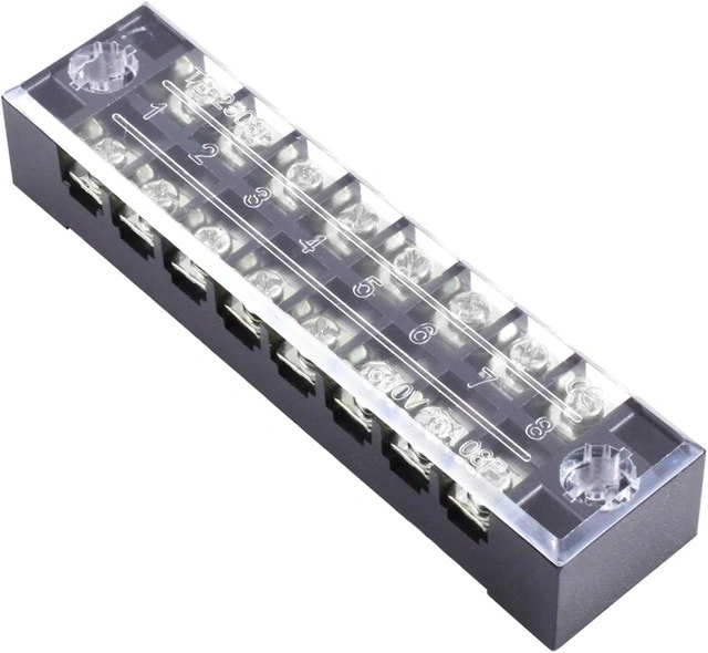 8 position 25A 600V terminal blocks. Protective cover to keep your connections clean. Great for wiring projects including car audio, networking, etc. Owner.