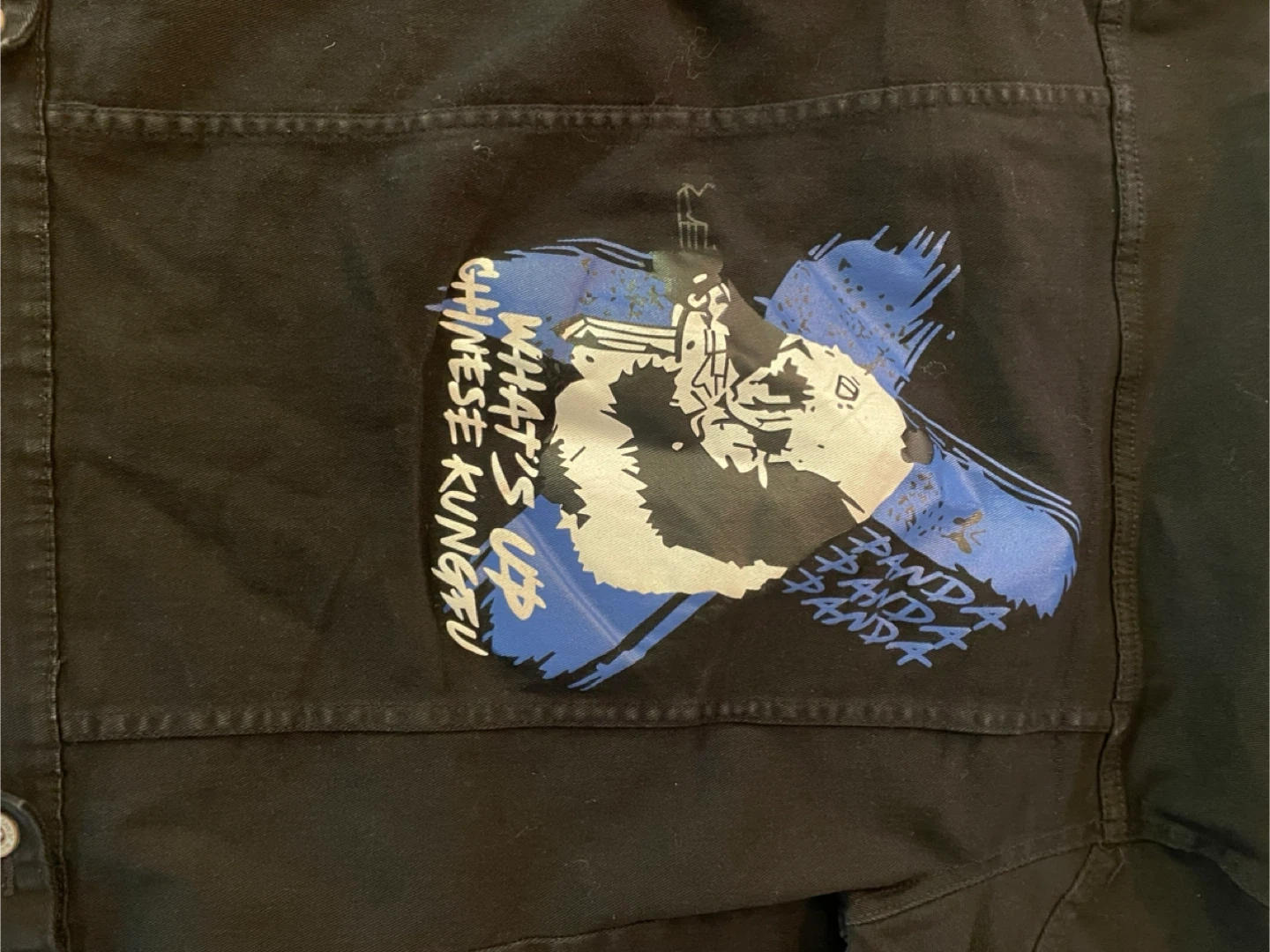 This is a black denim jacket with "Vogue Jeans Chileaionag" graphics on the front pocket and "What's Up Chinese Kungfu Panda Panda Panda" on the back. It's a size XXL. This jacket's bold graphics make a statement!