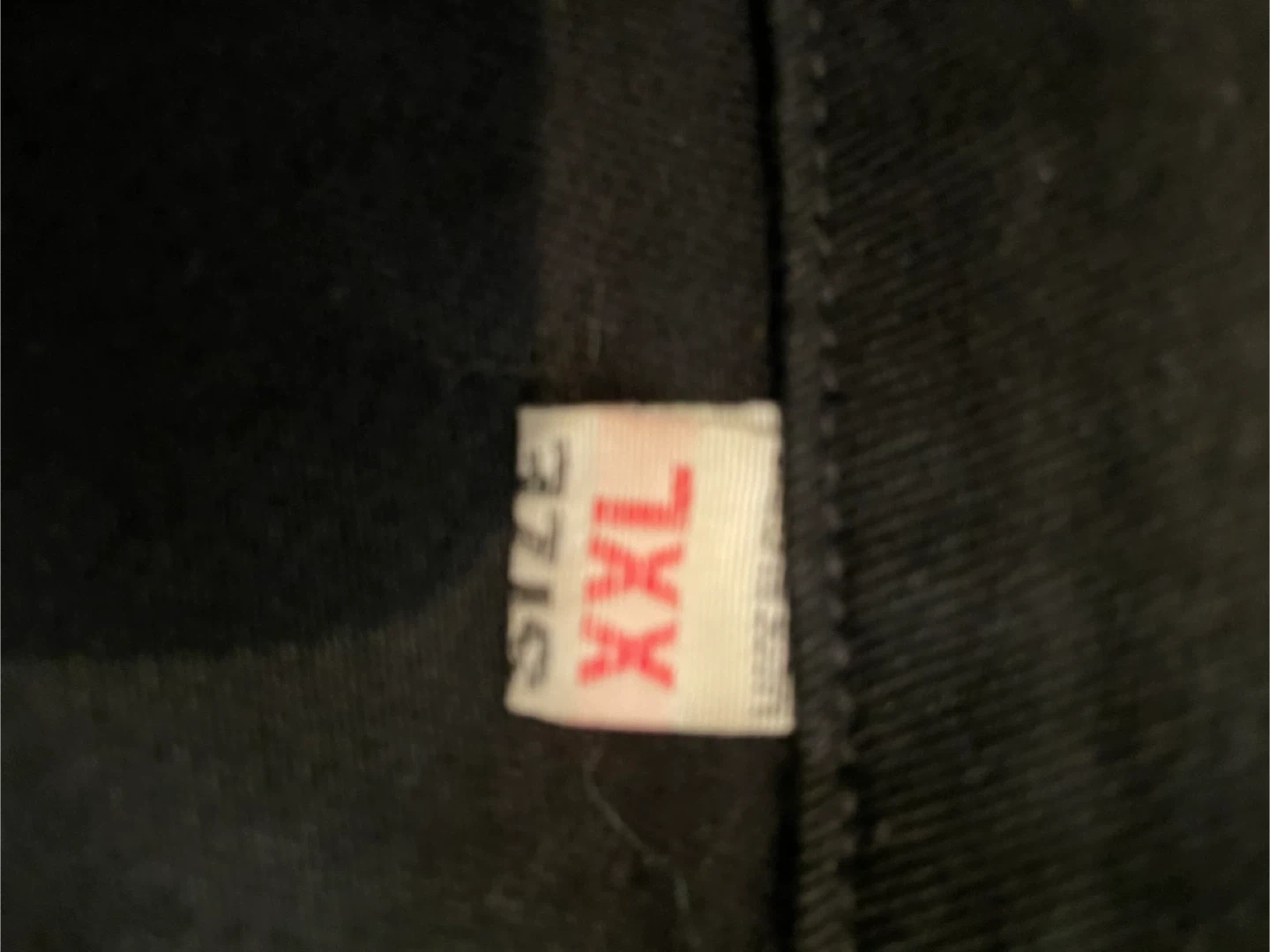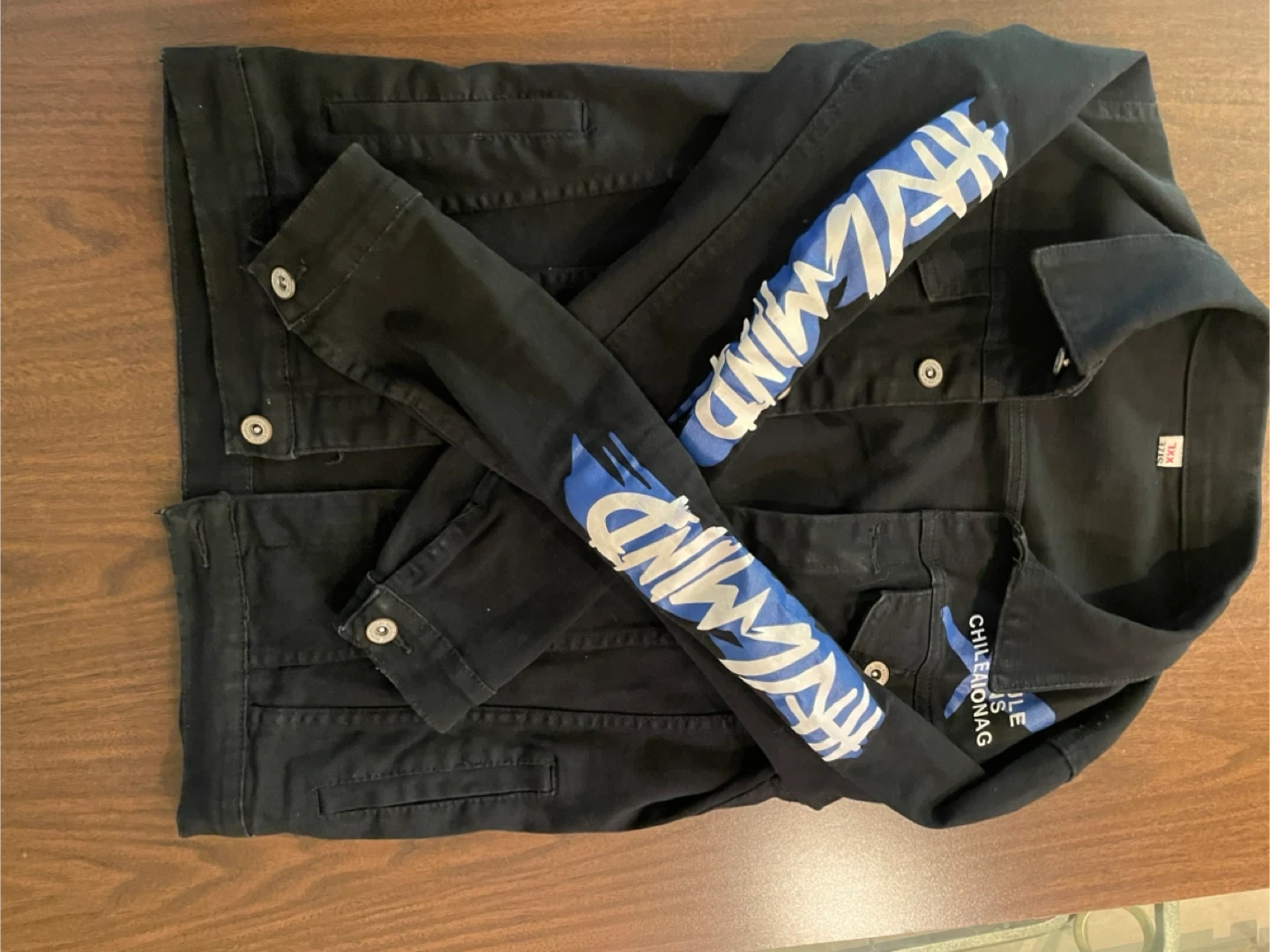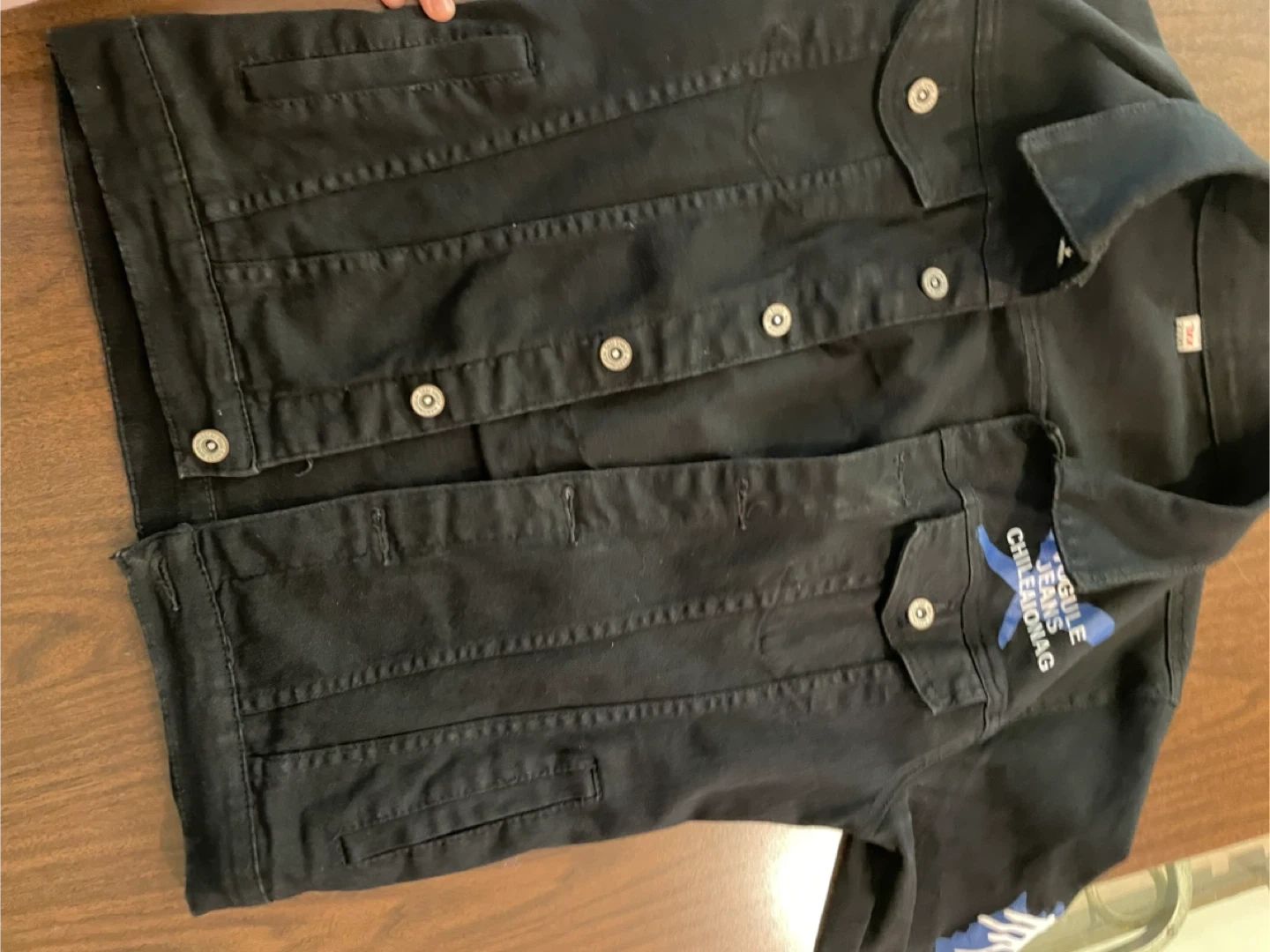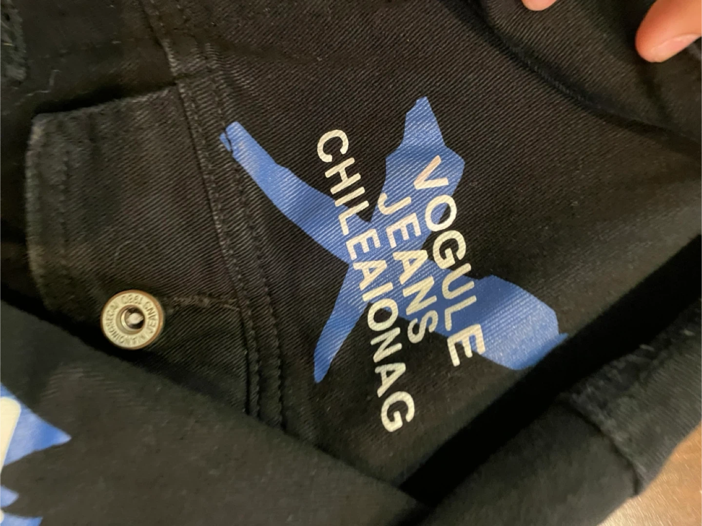 This is a black denim jacket with "Vogue Jeans Chileaionag" graphics on the front pocket and "What's Up Chinese Kungfu Panda Panda Panda" on the back. It's a size XXL. This jacket's bold graphics make a statement!