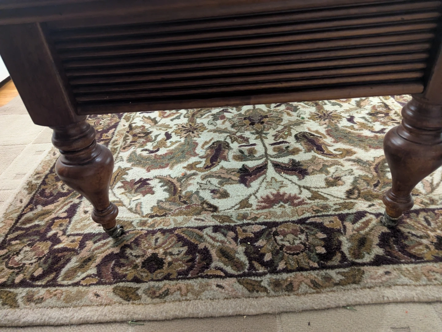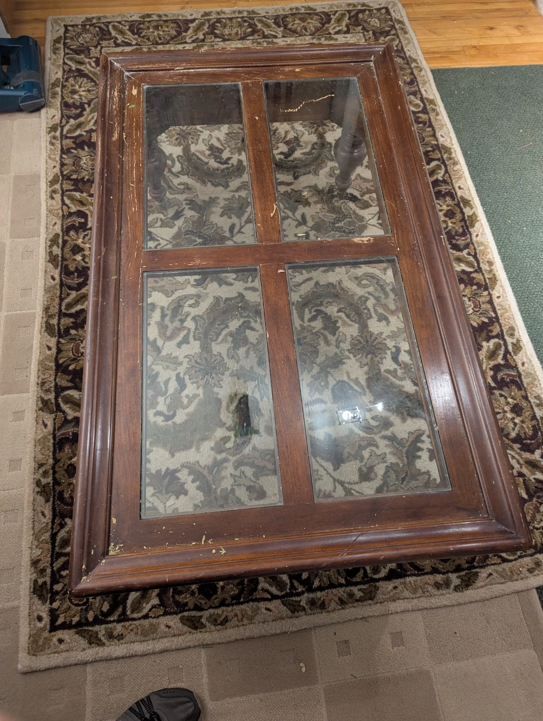 This is a classic wooden coffee table. It features a glass top with a patterned inlay. Some wear is visible on the wood.