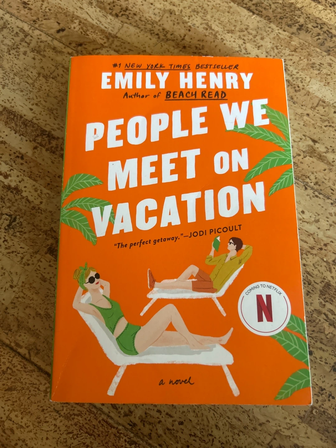 This is Emily Henry's novel, "People We Meet on Vacation". It's a #1 New York Times Bestseller and was written by the author of "Beach Read". "The perfect getaway." - Jodi Picoult.