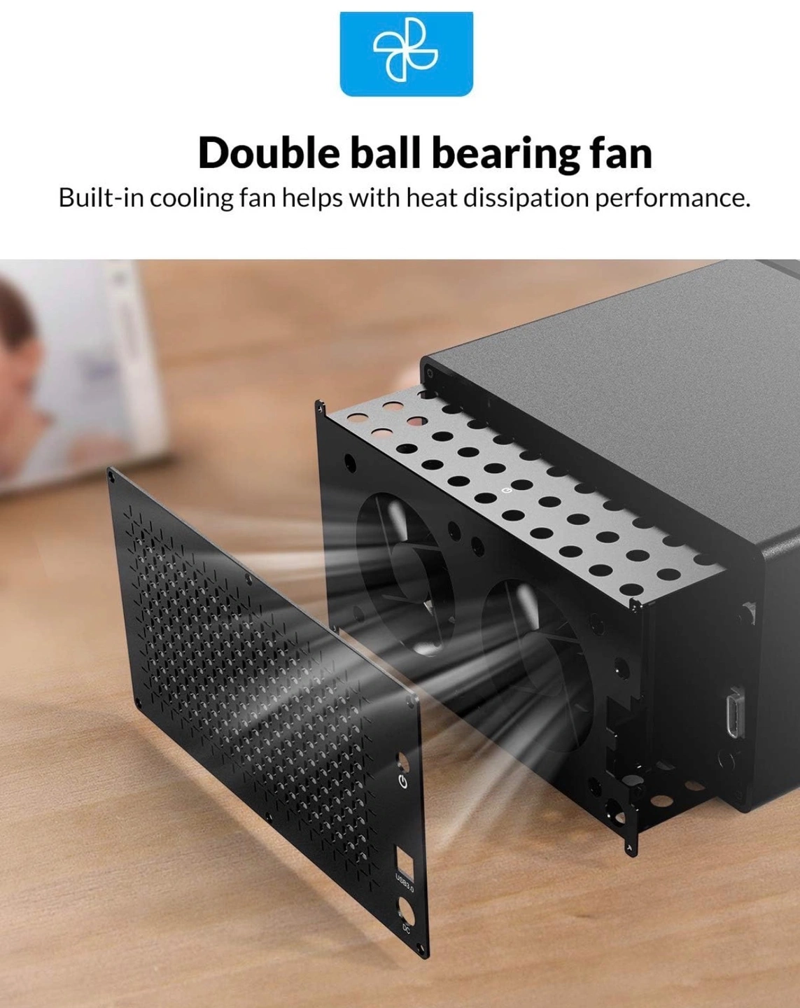 GOOD HEAT DISSIPATION PERFORMANCE -- Two 92mm cooling fans built in the 8 bay drive enclosure with honeycomb dissipation holes can helps the accelerated by the flowing wind.