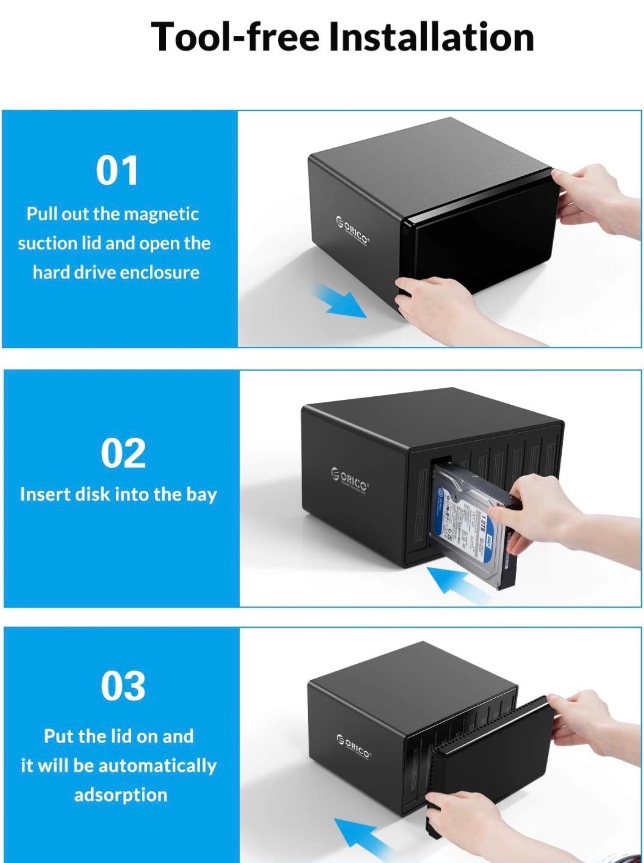 TOOL-FREE INSTALLATION -- The construction of the multi drive enclosure is magnetics design with 8 magntic chips on the cover, you can just spend 3 seconds to complete drive installation and prolong the service life of the cover.