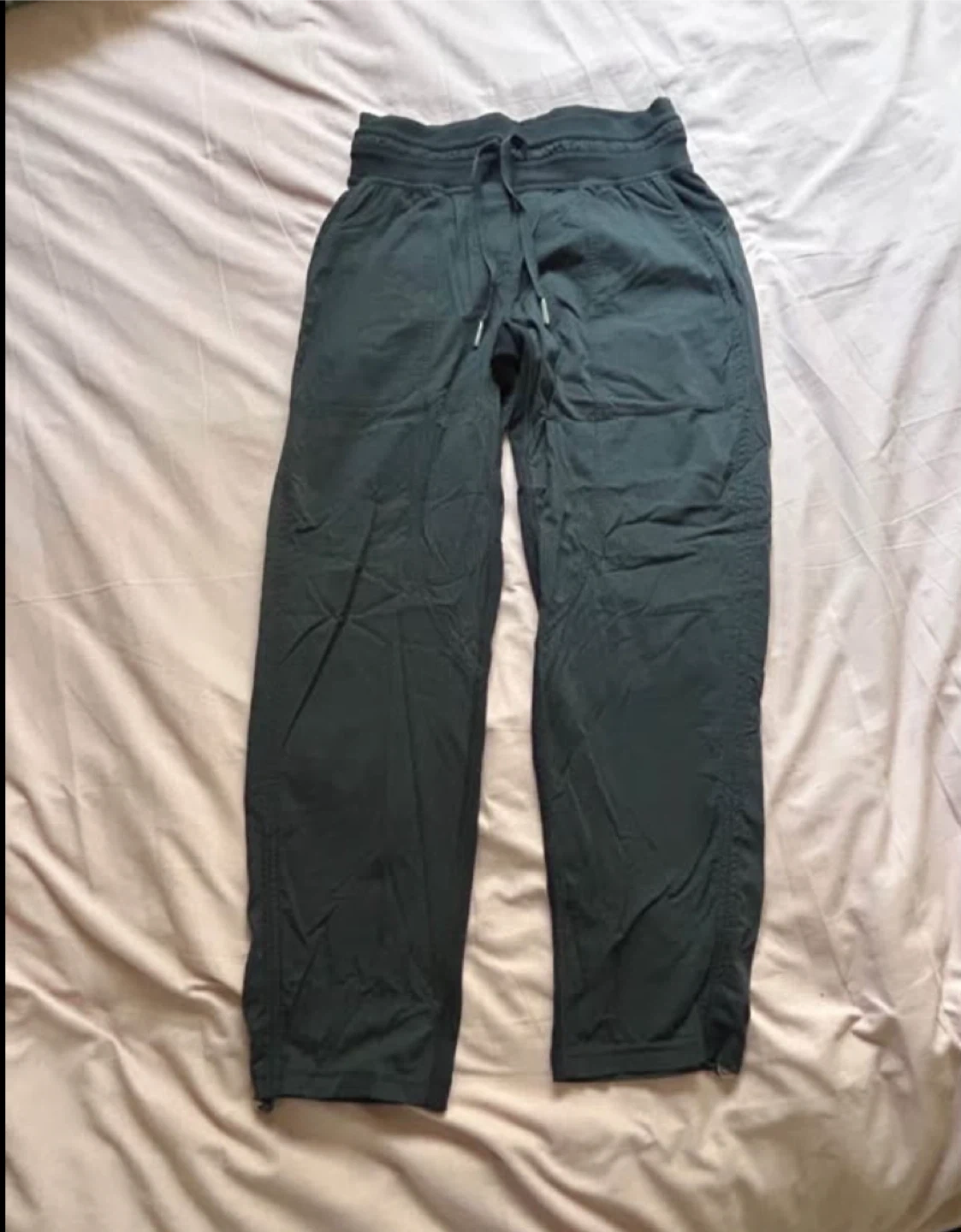 These Lululemon studio pants are black with a subtle vertical stripe detail. They feature a comfortable waistband and a drawstring closure. Size is 2.