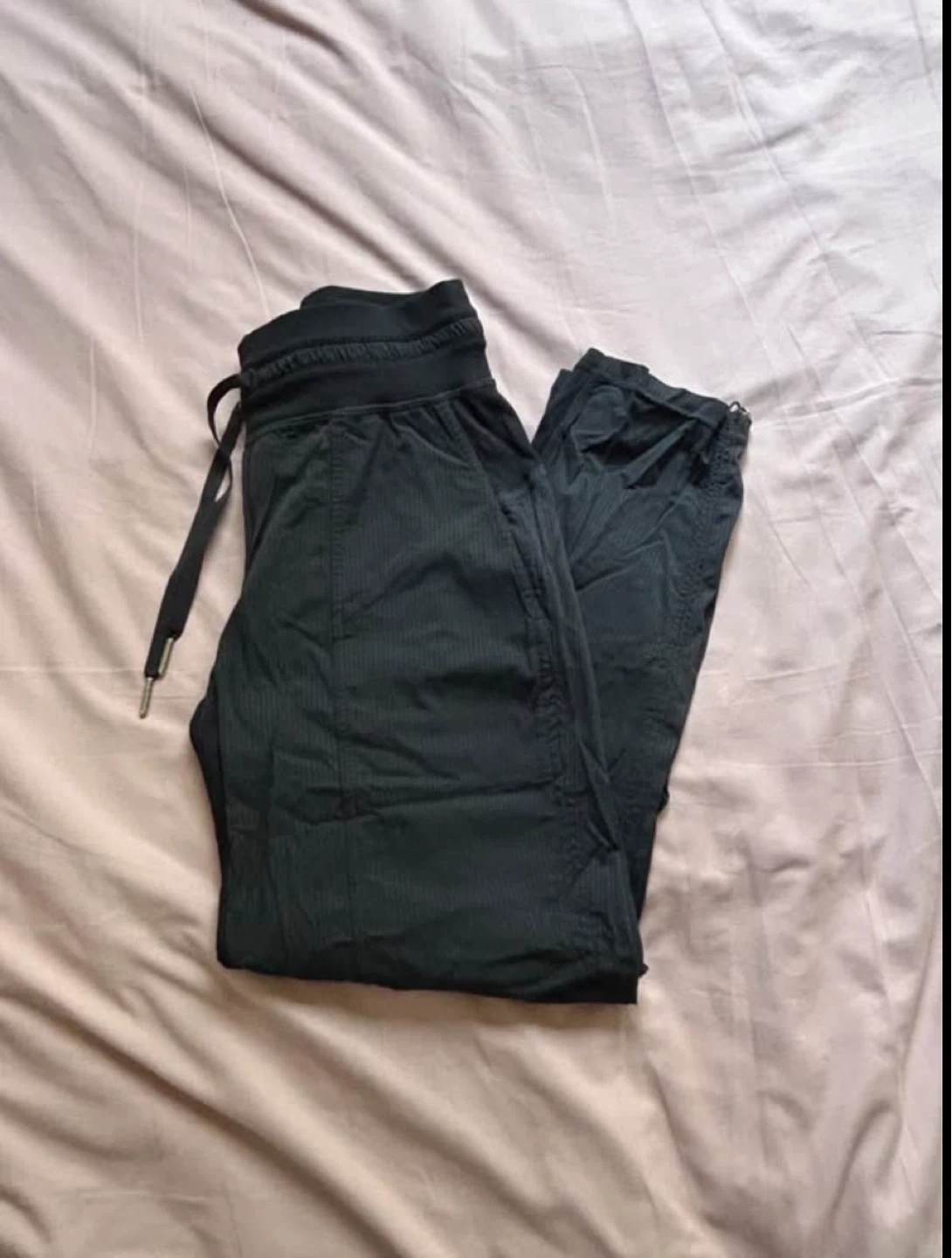 These Lululemon studio pants are black with a subtle vertical stripe detail. They feature a comfortable waistband and a drawstring closure. Size is 2.